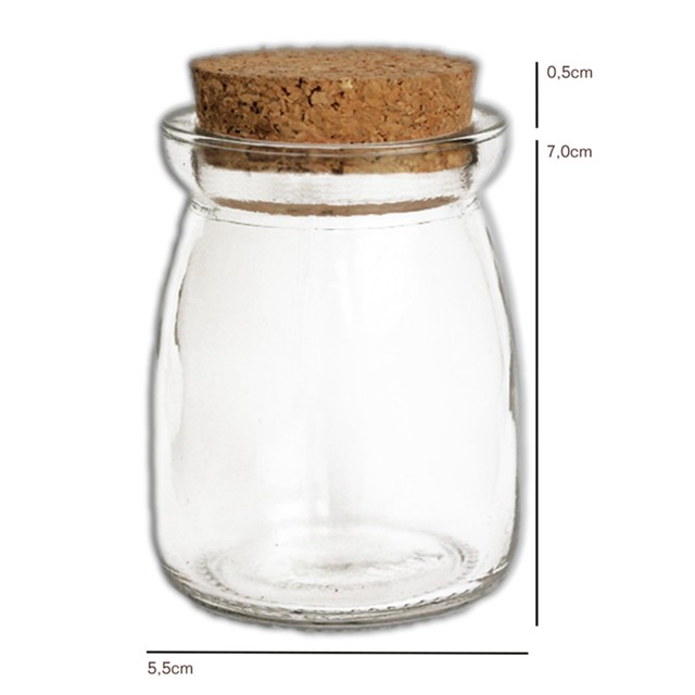 Pote de Vidro com Rolha 100ml - 100 Unidades Medidas de Cada Pote: 7,0cm de altura + 0,5cm rolha 5,5cm largura Largura da boca: 4cm Altura da rolha: 1cm