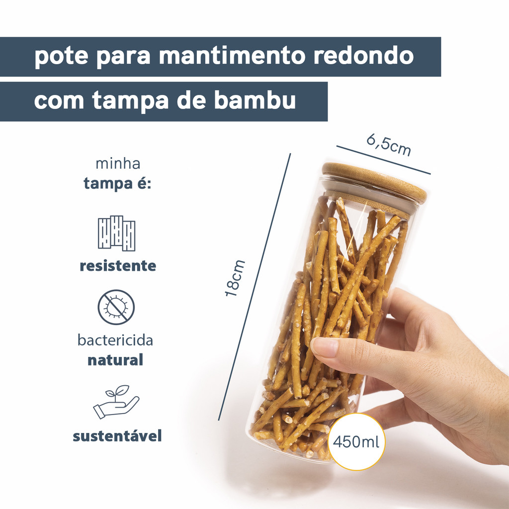 Esse é o pote de vidro hermético redondo de 450ml para mantimentos com tampa de bambu da OIKOS. Não julgue pelas aparências, ele não é só um potinho bonito: com a combinação da vedação de silicone e o bambu antibactericida, esse pote se torna um verdadeiro mestre na conservação de alimentos! E não é só de comida que vive esse pote: moedas, curativos, balas, fios, botões, chocolates, dados, bola de gude e o que mais você quiser guardar - isso que é versatilidade.