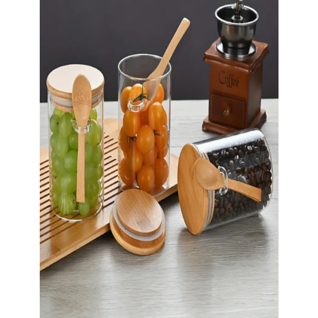 Pote De Vidro Hermético Tampa De Bambu 650ml Com Colher De Bambu