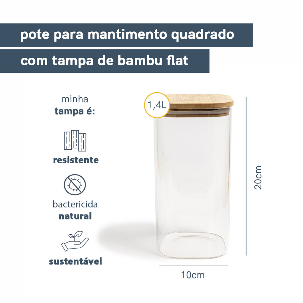 Pote De Vidro Mantimentos Quadrado Flat 1400ml Tampa Bambu - Oikos