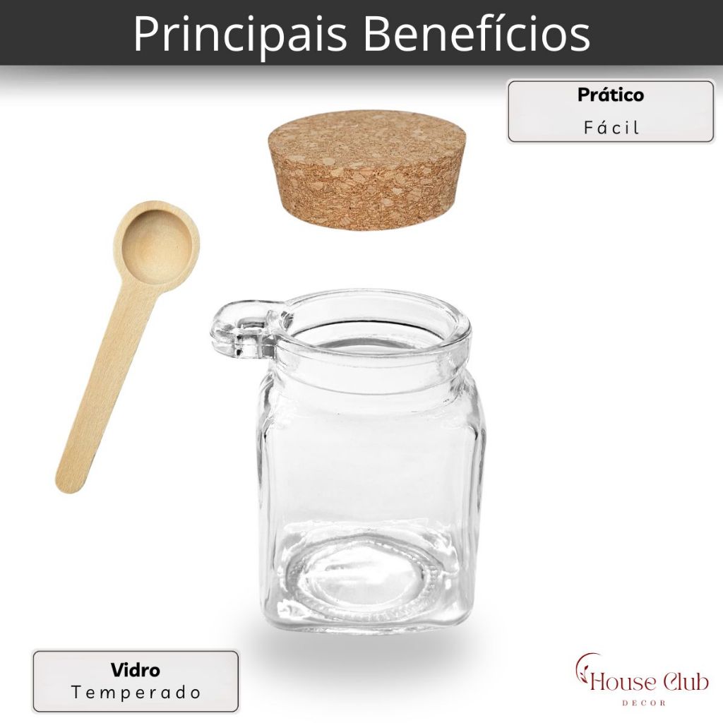 Pote de Vidro Quadrado Transparente 260ml com Tampa de Rolha Cortiça e Mini Colher de Madeira