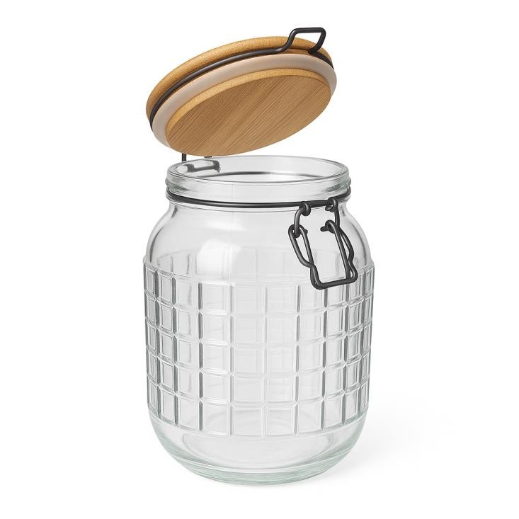 Pote de Vidro Redondo Transparente Quadriculado com Tampa de Bambu e Trava 800 ml Resistente