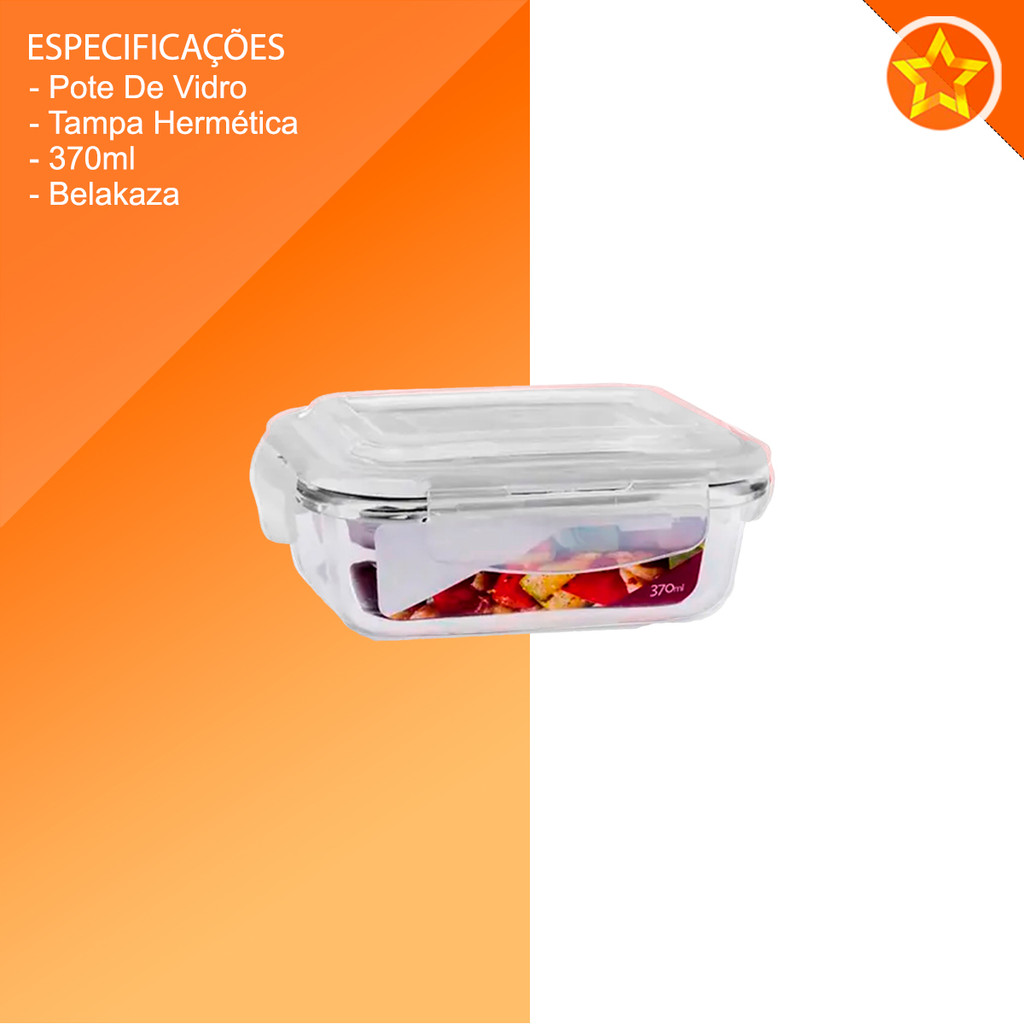 Potes de Vidro Retangular com Tampa Hermética 370ml Troque os seus potes de plástico por uma solução mais saudável e durável com os Potes de Vidro Hermético Belakaza. Eles são resistentes, fáceis de limpar e suportam temperaturas até 300°C, podendo ir ao micro-ondas, forno (sem tampa) e congelador. Com vedação perfeita graças ao anel de silicone removível e 4 super travas, os alimentos mantêm-se frescos por mais tempo, sem odores ou vazamentos. As tampas são livres de BPA, garantindo total segurança. Principais Características: - Anel de silicone removível para uma limpeza fácil e uma vedação perfeita. - Super travas que garantem a segurança e frescura dos alimentos por mais tempo. - Suporta variações térmicas de até 300°C (evitando choque térmico). - Mantém os alimentos frescos e impede a propagação de cheiros. - Compatível com forno convencional, forno elétrico, micro-ondas e congelador (sem a tampa). - Tampa livre de BPA (Bisfenol A), garantindo ainda mais segurança alimentar.