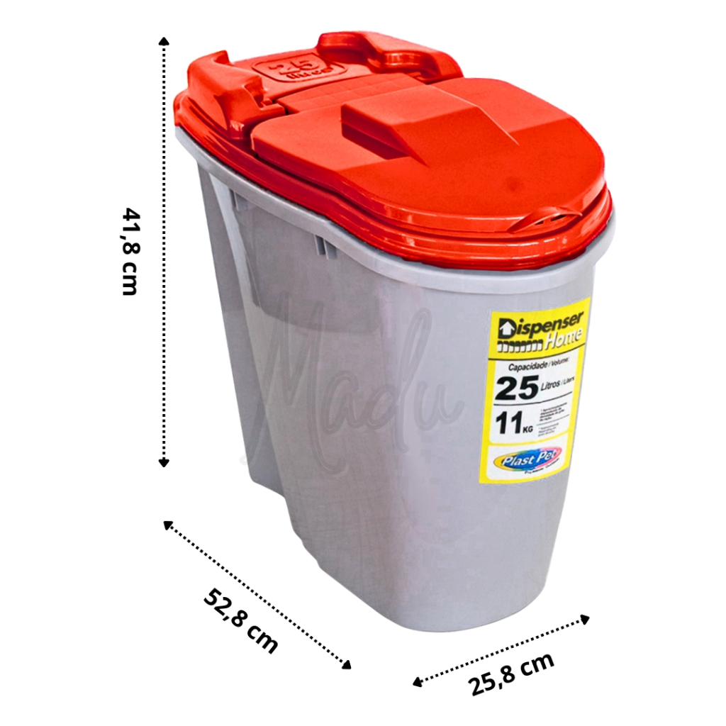 *** ENVIO EM 24 HORAS *** 25 LITROS - 11 KILOS 25 Litros: C 52,8 cm | x L 25,8 cm | x A 41,8 cm A Plast Pet apresenta o Dispenser Home / Dispenser Home Full, armazenador de ração ou qualquer tipo de grão. Este produto facilita e otimiza o armazenamento do alimento do seu pet em casa pois veda perfeitamente a ração e a mantém em seu perfeito estado.