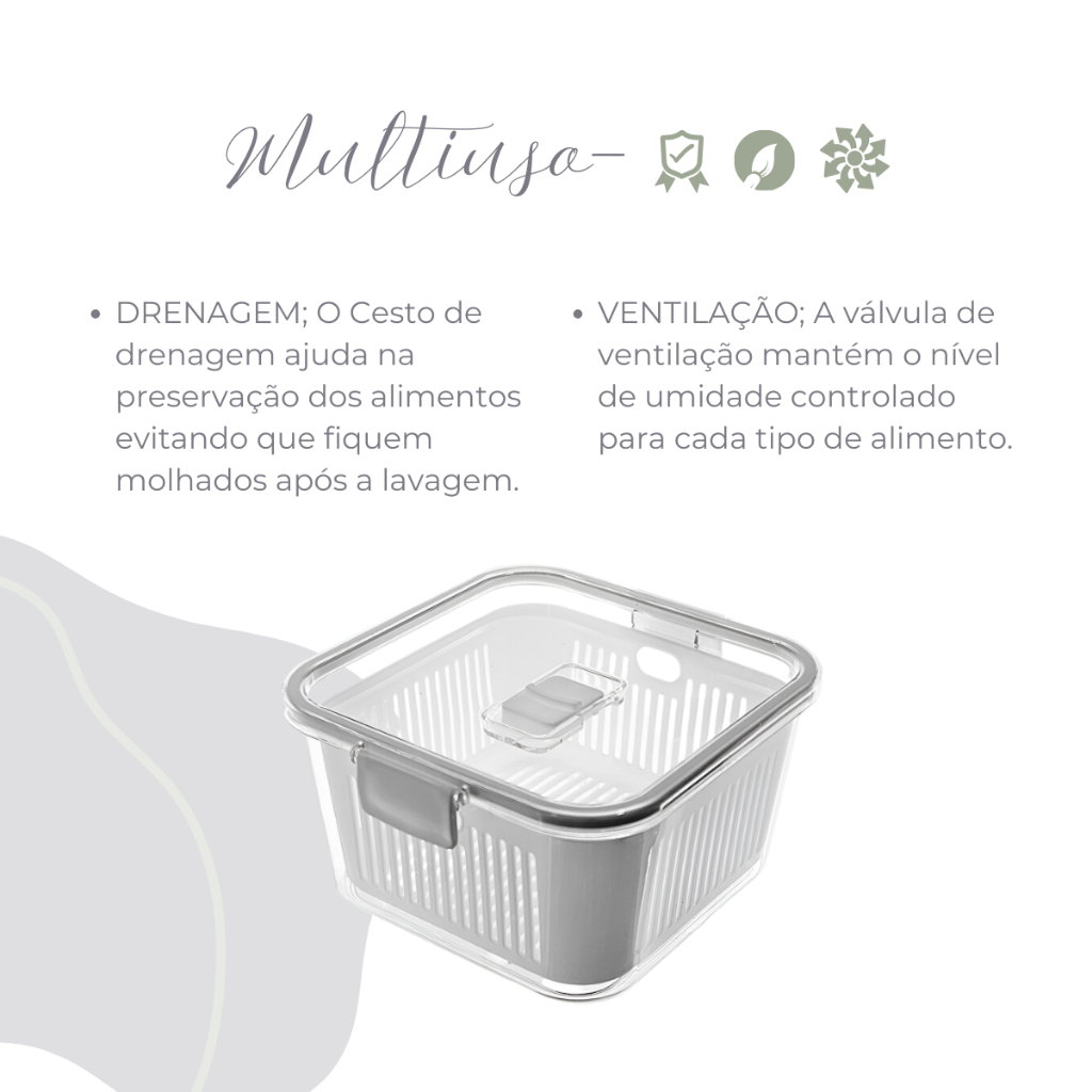 O Organizador de Geladeira Pote de Acrílico com Tampa de Trava Hermética 1,3L é um item ideal para otimizar o espaço e a organização da sua geladeira. Aqui estão alguns detalhes sobre este produto: Capacidade: 1,3 litros, o que oferece um tamanho adequado para armazenar porções médias de alimentos. Material: Fabricado em acrílico, proporcionando resistência e durabilidade. É também transparente, permitindo fácil visualização do conteúdo. Tampa Hermética: A tampa possui um sistema de trava hermética, garantindo que os alimentos fiquem protegidos e conservem sua frescura por mais tempo. Este mecanismo impede a entrada de ar, mantendo saladas, frutas e outros alimentos mais frescos e saborosos. Uso Versátil: Ideal para armazenar uma variedade de alimentos, como frutas, saladas, legumes e outros itens perecíveis. Pode ser utilizado também para organizar outros itens na geladeira. Design Prático: O design é compacto, facilitando a organização em prateleiras da geladeira sem ocupar muito espaço. Pode ser empilhado com outros potes para uma organização ainda mais eficiente. Fácil de Limpar: O acrílico facilita a limpeza e manutenção, podendo ser lavado manualmente ou na máquina de lavar louças. Esse organizador é uma excelente escolha para quem busca manter a geladeira organizada e os alimentos bem conservados. Ideal para uso diário ou para preparar refeições antecipadamente e armazená-las de forma segura.
