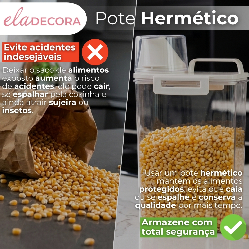 Pote Hermético com Copo Medidor 2,5 Litros Exclusivo Ela DecoraO Pote Hermético 2,5L da Ela Decora é a solução ideal para quem busca capacidade maior, vedação absoluta e praticidade superior em um produto exclusivo, desenvolvido fora dos padrões comuns do mercado. Seu sistema de vedação hermética avançado bloqueia completamente a entrada de ar e umidade, preservando alimentos e produtos por muito mais tempo. A vedação eficiente também permite o armazenamento seguro de líquidos, sem risco de vazamentos. O copo medidor integrado à tampa transforma a rotina, permitindo medir e servir com precisão, rapidez e sem desperdícios. Tudo pensado para facilitar o uso diário e manter o ambiente sempre limpo e organizado. Perfeito para armazenar grandes volumes de arroz, feijão, grãos, cereais, farinha, açúcar, ração, produtos de limpeza líquidos ou em pó, oferecendo versatilidade tanto para a cozinha quanto para a lavanderia. Produzido com material resistente e durável, o pote alia funcionalidade, design inteligente e acabamento premium, sendo um verdadeiro aliado na organização da casa. Medidas do produto Capacidade: 2,5 litros Altura: 29 cm Largura: 16 cm