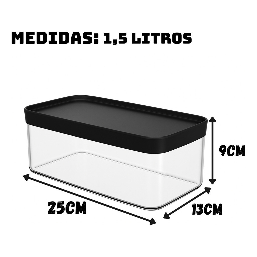 Pote Hermético Retangular para Pães e Bolos 1,5L – Helsim (Tampa Preta ou Tampa Branca) Medidas: 25cm (comprimento) x 13cm (largura) x 9cm (altura) Organize e conserve seus alimentos com praticidade e elegância. O Pote Hermético Retangular Helsim é ideal para armazenar pães, bolos e outros alimentos, mantendo-os frescos por mais tempo graças à sua tampa com vedação hermética. Disponível nas opções tampa preta ou tampa branca, para você escolher a que mais combina com a sua cozinha. Produzido em policarbonato cristal (acrílico reforçado), o pote é resistente, transparente e fácil de limpar. Sua tampa possui design plano que permite empilhamento seguro, ajudando a economizar espaço na cozinha. Características: Capacidade: 1,5L Material: Policarbonato cristal transparente (acrílico reforçado) Tampa plástica com anel de vedação emborrachado Disponível nas cores: preta ou branca Ideal para pães, bolos e diversos alimentos Design empilhável Resistente e de alta durabilidade Pode ir à lava-louças (utilizar de forma adequada) Medidas: Comprimento: 25cm Largura: 13cm Altura: 9cm Cuidados: Não recomendado para micro-ondas Não recomendado para freezer Higienizar com detergente neutro e esponja macia Na lava-louças, posicionar corretamente para evitar danos