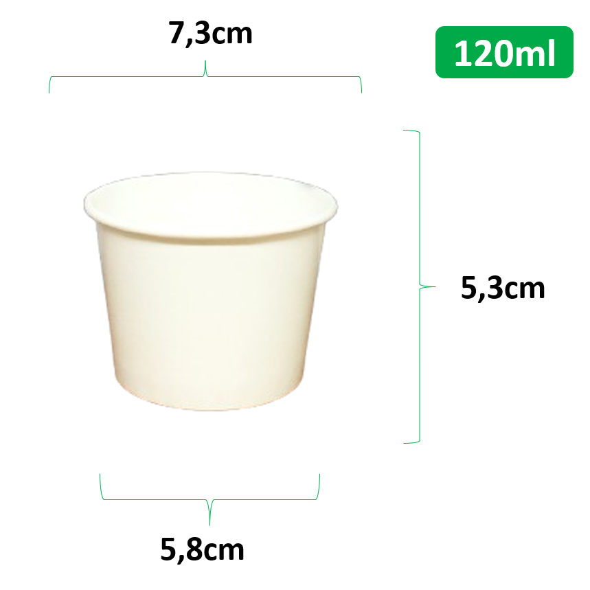 * 50 UNIDADES COM TAMPA * Pacote com 50 potes + tampas de 120ml descartáveis/biodegradáveis fabricados em papel cartão. Próprio para contato com alimentos e bebidas quentes e frios. ESPECIFICAÇÕES TÉCNICAS - Matéria prima: Papel cartão asséptico, revestido com PE (polietileno) - Quantidade: 50un - Capacidade: 120ml - Altura: 5,3cm - Diâmetro superior: 7,3cm - Diâmetro inferior: 5,8cm