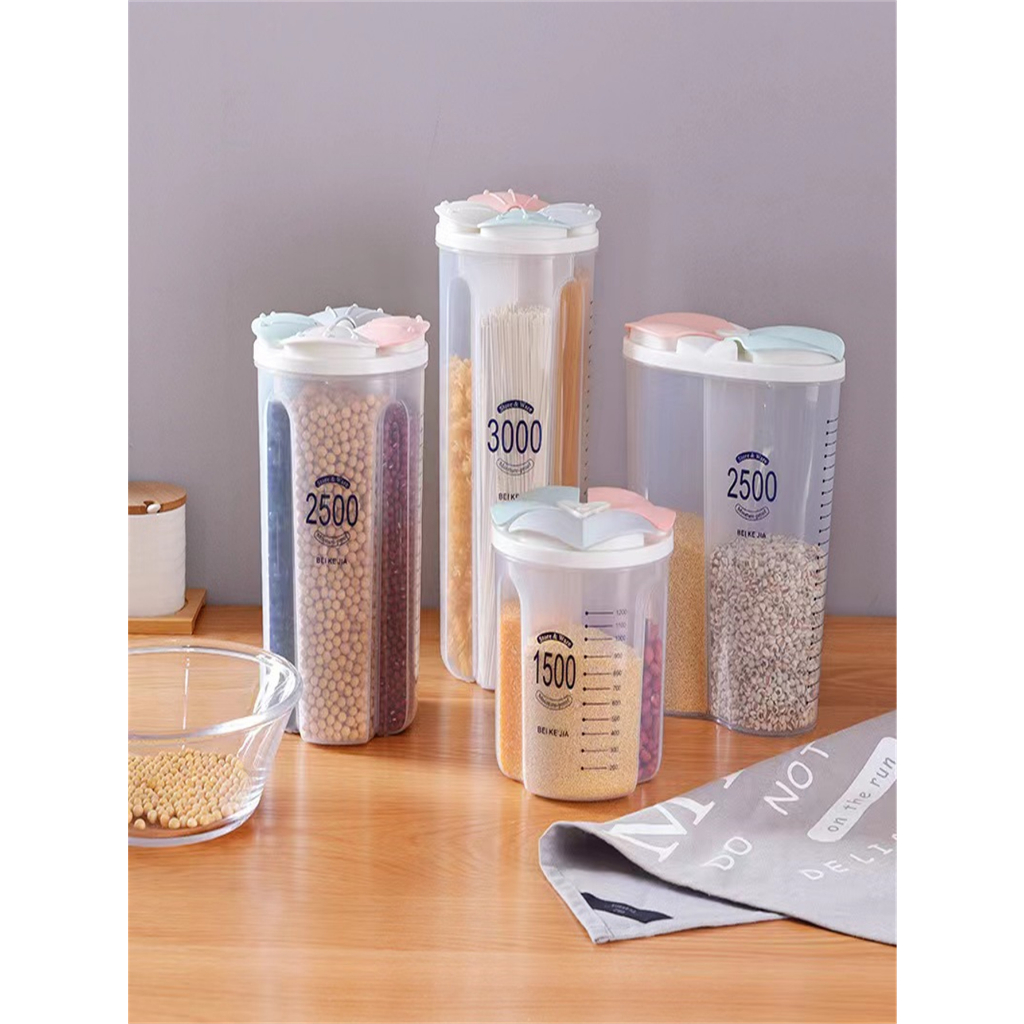 Armazene até 4 itens em um único pote: arroz, feijão, macarrão, café, açúcar, as opções são infinitas. Dividido em quatro partes, possibilita o armazenamento de diversos tipos de cereais e acaba de vez com a bagunça na cozinha, além claro, de ganhar tempo na preparação das refeições. Com 2.500ml de capacidade, permite guardar alimentos para até mesmo um mês de uso! Espaço é o que não falta neste pote. Fabricado em plástico transparente e sem BPA para que não haja entrada de toxinas nos alimentos. Além disso, o plástico utilizado é de extrema qualidade e de alta durabilidade. - Material: Plástico PP livre de BPA - Capacidade total: 2500ml - Dimensões aproximadas: 24,5 x 12,5 cm