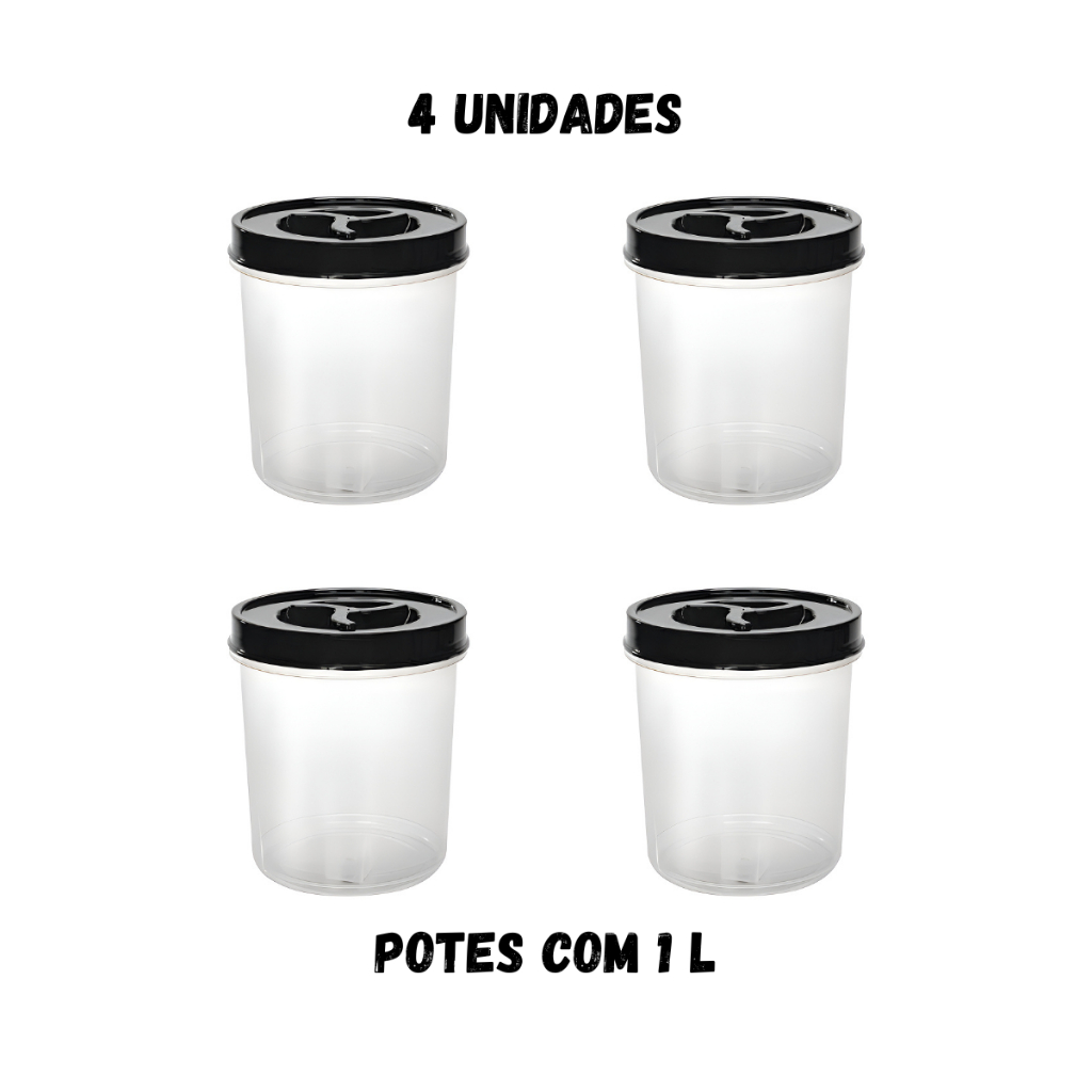 Kit 4 Potes Porta Mantimentos 1L Herméticos Redondos Plástico BPA Free - Freezer, Micro-ondas, Lava-Louças - Organizador de Cozinha Multiuso Descubra o Conjunto Perfeito para Sua Cozinha: Kit 4 Potes Porta Mantimentos Herméticos 1 Litro! Transforme a organização da sua despensa com este conjunto exclusivo de 4 potes porta mantimentos redondos de 1 litro cada. Projetados para a vida moderna, esses organizadores de cozinha são a solução ideal para manter seus alimentos frescos, visíveis e acessíveis. Por Que Nossos Potes Porta Mantimentos São Indispensáveis: - Capacidade Ideal: Cada pote possui 1 litro (1000ml), perfeito para armazenar grãos, cereais, açúcar, café, biscoitos, farinhas, massas e muito mais. - Qualidade Premium e Segurança Alimentar: Confeccionados em plástico prime transparente de alta durabilidade, são 100% livre de BPA (BPA Free). Isso garante que seus alimentos não terão contato com substâncias nocivas, mesmo sob variações de temperatura. - Fechamento Hermético e Seguro: A tampa de rosca com fechamento fixo e firme proporciona uma vedação perfeita, protegendo seus mantimentos da umidade, insetos e da perda de sabor e crocância. Diga adeus aos alimentos murchos! - Versatilidade Extrema: Sua rotina na cozinha ficou mais fácil! Estes potes são resistentes e podem ser levados ao freezer, micro-ondas e lava-louças, oferecendo máxima praticidade no uso e na limpeza. - Higiene e Praticidade: Material que não enferruja, é leve e fácil de limpar, mantendo sua cozinha sempre impecável. - Design Inteligente: O corpo transparente permite identificar rapidamente o conteúdo, otimizando seu tempo e evitando o desperdício. Ideal Para: - Organizar a despensa com estilo e eficiência. - Conservar alimentos frescos por muito mais tempo. - Levar ao micro-ondas para aquecer porções (sem a tampa). - Congelar alimentos com segurança no freezer. - Facilitar a limpeza na lava-louças. Características do Produto: - Conteúdo: 4 potes porta mantimentos redondos - Capacidade Individual: 1 Litro (1000ml) - Material: Plástico Prime Transparente (Livre de BPA) - Cor da Tampa: Preto Dimensões (por unidade): - Altura: 13cm - Largura: 120cm - Comprimento: 120cm Cuidados: Para preservar a vida útil do produto, evite o uso de produtos abrasivos ou corrosivos na limpeza. Adquira já o seu Kit de Potes Porta Mantimentos e transforme a organização da sua cozinha com praticidade, segurança e elegância!