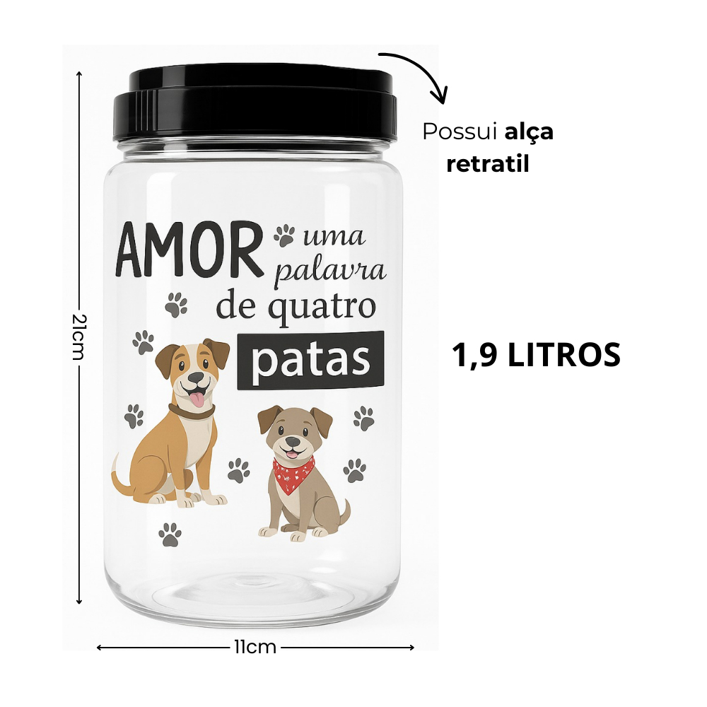 Pote de Ração – 1,9L Com Alça Mantenha a ração do seu pet sempre fresca, organizada e protegida com este prático pote de 1,9 litros. Ideal para armazenar a quantidade certa de alimento, ele conta com tampa de rosca que evita a entrada de umidade e mantém o sabor e os nutrientes da ração por mais tempo. O design compacto é perfeito para facilitar o dia a dia, e a alça resistente garante mais praticidade no transporte, seja em casa ou em viagens. - Capacidade: 1,9L - Com alça para transporte fácil - Tampa com fechamento seguro - Ideal para ração seca ou petiscos Mais organização, menos bagunça e muito mais carinho para seu pet! DADOS TÉCNICOS Altura: 21cm Largura: 11cm