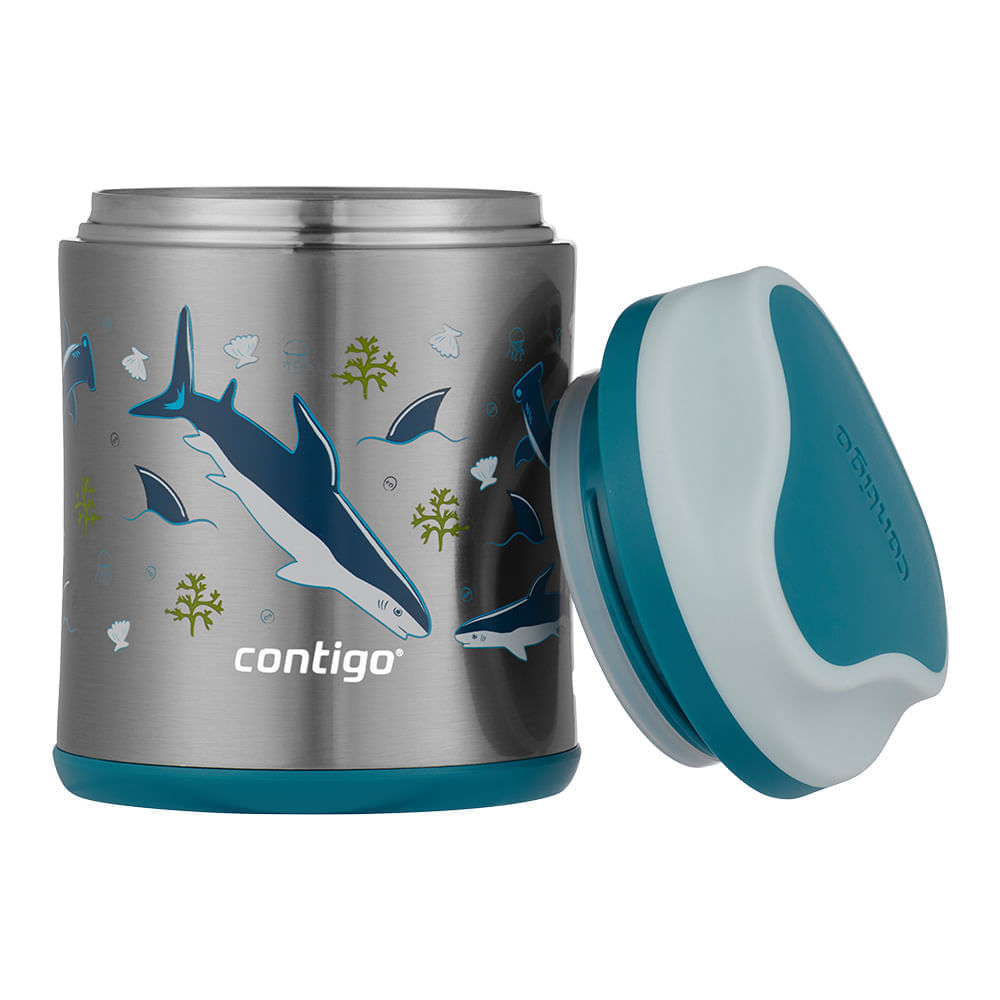 Torne as refeições dos pequenos mais divertidas e práticas com o Pote Térmico Kids Contigo, feito para conservar alimentos quentes ou frios por horas, com design alegre e materiais seguros para uso infantil. Recomendado para crianças a partir de 3 anos. Ideal para levar à escola, em passeios ou para manter a alimentação equilibrada em qualquer lugar. Principais benefíciosIsolamento Térmico Avançado: Mantém sopas, frutas, vegetais ou lanchinhos na temperatura ideal por horas, graças à tecnologia de parede dupla com vácuo em aço inox.Design Colorido e Lúdico: Estampa exclusiva de sereia que transforma o momento da refeição em uma experiência mais alegre e atrativa para as crianças.Base Antiderrapante: Mais firmeza e segurança sobre mesas e bancadas, menos riscos de quedas e bagunça.Tampa de Rosca com Vedação Segura: Evita vazamentos mesmo em movimento, garantindo que a comida fique protegida.Fácil de Limpar: A tampa e o corpo vão na parte superior da lava louças, facilitando a rotina dos pais.Seguro e Durável: Fabricado com aço inoxidável resistente, livre de BPA e seguro para o uso diário das crianças. Conserva por mais tempoBebidas quentes por até 6 horasBebidas frias por até 7 horas Garantia12 meses Capacidade295ml Conteúdo da Embalagem1 Pote Térmico Kids Tubarão1 Manual Mais praticidade, autonomia e diversão no dia a dia dos pequenos, com a confiança Contigo.