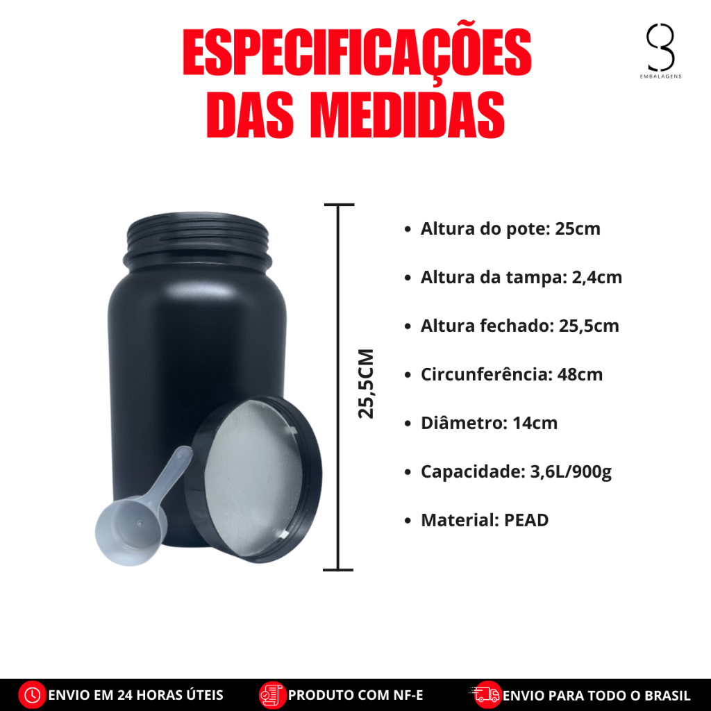 Pote Vazio Para Whey 3.6L Com Tampa e Scoop 30g - 1 Unidade