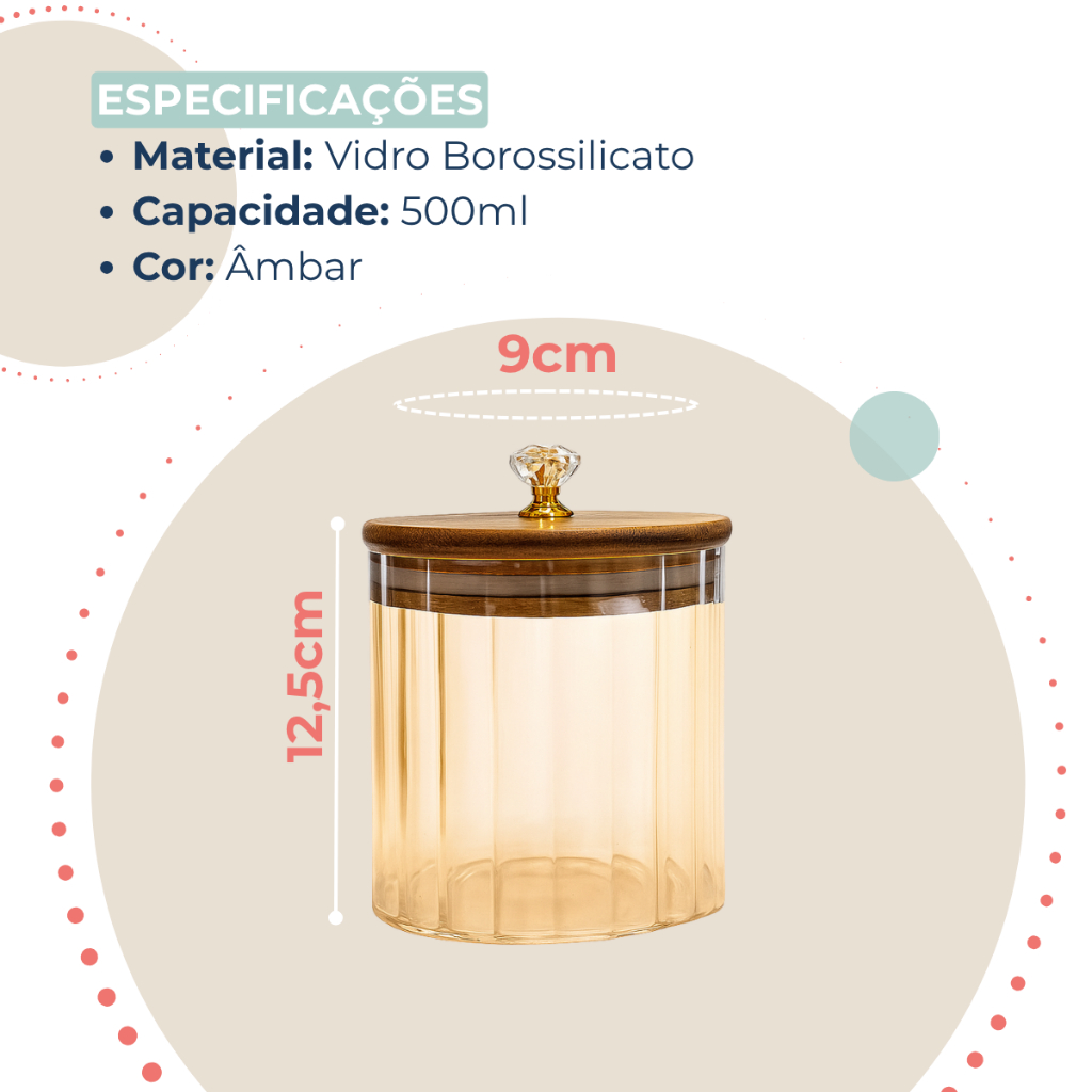 Pote Vidro Borossilicato Canelado Âmbar Com Tampa de Bambu 500ml Puxador Luxo