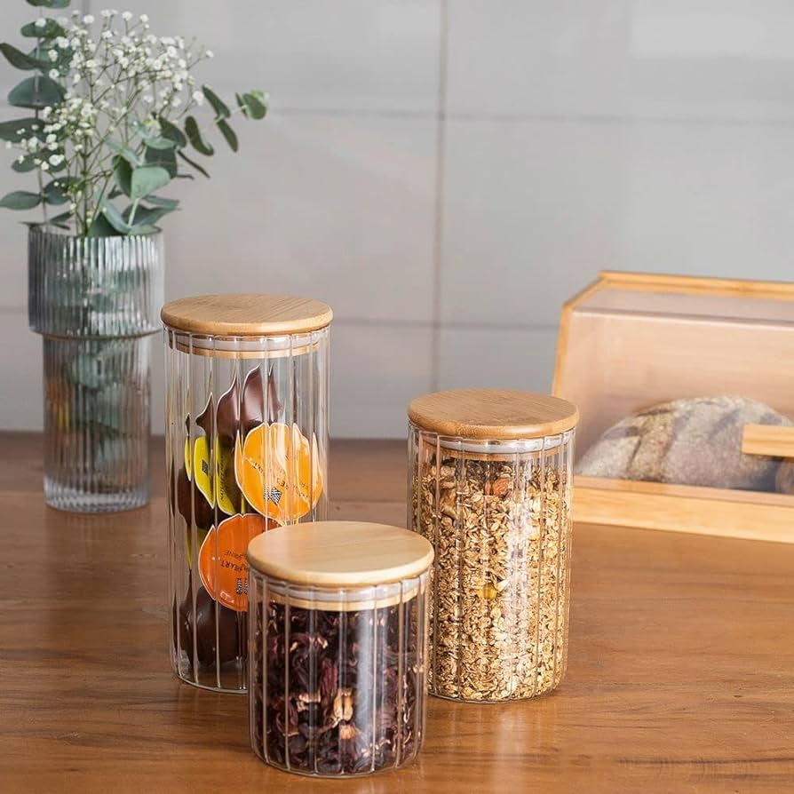 Pote Vidro Canelado Hermético 500ml Porta Mantimentos Com Tampa Bambu