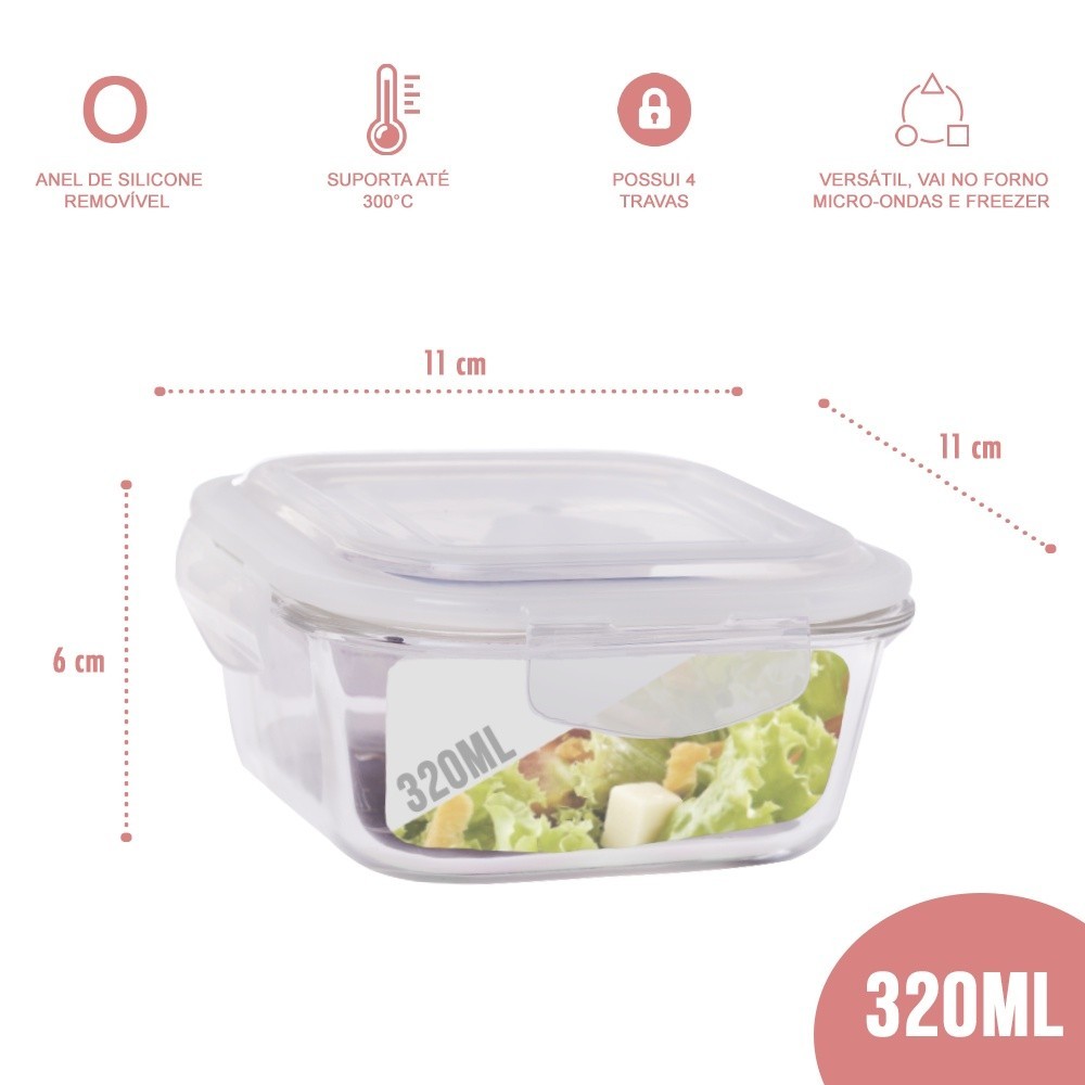Conjunto com 2 Potes de Vidro com Tampa Hermética Quadrado 320ml Os potes com tampas herméticas Click Glass são perfeitos para o dia a dia, garantem o melhor sabor, não fica com cheiro indesejado e você pode esquentar no Microondas ou Forno (Tire a tampa nesses casos), ideal para quem trabalha e leva o alimento de casa, ou para guardar diversos alimentos na geladeira/freezer. Além do mais, é fácil de lavar e super resistente. Praticidade com qualidade veja os diferenciais: · Vidro Borosilicato; · Vai ao forno (sem tampa), micro-ondas (sem tampa) e freezer; · Anel de silicone removível; · Mantém os alimentos frescos por mais tempo; · Evita que o cheiro se espalhe; · Sem risco de vazamento; · Possui 4 travas; · Fácil de limpar e higienizar; · Super Resistente. Postamos com agilidade Informações complementares: Modelo: Pote de Vidro com Tampa Hermética Quadrado Marca: Quality House / Univendas Material: Vidro Capacidade: 320 ml Altura: 6,5 cm Largura: 12,0 cm Peso: 325g Itens inclusos: 2 Unidades do Item descrito acima Ficou com alguma duvida, deixe sua pergunta nos comentários e teremos o prazer em te responder.