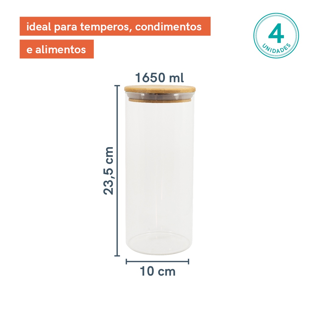 Potes de Vidro P/ Mantimentos 1650ml C/ Tampa Bambu - 4 Pçs Oikos