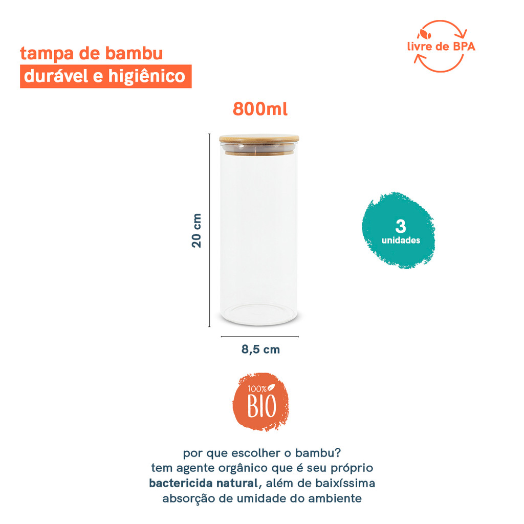 "conheça o kit de 3 potes herméticos de vidro com tampa de bambu 800ml da Oikos! prático, multiuso e moderno, é o kit ideal para armazenar e conservar temperos e alimentos. além disso, os potes podem ser utilizados para guardar diversos outros itens, como: fios, acessórios, algodão e o que precisar! possuem design moderno, com tampa de bambu natural que harmoniza com diversos estilos de decoração e cai bem em diferentes ambientes. são de vidro borossilicato e bambu. para limpar a parte de vidro, basta lavar em água corrente com sabão neutro. para a parte de bambu, é só passar um pano úmido e deixar secar em local arejado. não deixe a tampa de bambu imersa na água. coloque apenas o vidro na lava-louças. leve modernidade e qualidade para sua casa! o kit contém: 3 potes de vidro herméticos com tampa de bambu de 800ml medidas: altura: 20cm diâmetro: 9cm"