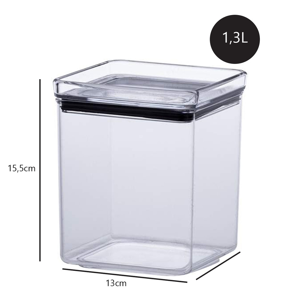 Combo com 4 potes 1,3L empilháveis multiuso com tampa hermética e silicone para vedação Organize seus alimentos de forma prática e elegante. Os Potes de Acrílico Hermético com Tampa Empilhável e Silicone são ideais para mudar a forma como você guarda seus alimentos e utilidades da casa, além de contribuir para a decoração do ambiente. Com múltiplas possibilidades de uso, atendem a diversas necessidades, permitindo armazenar e organizar itens como jogos, algodão, dados, frutas, chaves, biscoitos, cápsulas, fios, pregadores, rolhas, lápis, brinquedos, espaguete, cereais e muito mais. Devido à vedação eficaz com silicone e tampa, os itens são preservados por mais tempo. Os Potes Herméticos são fáceis de limpar, não deixam marcas nem retêm odores. Os Potes Herméticos são empilhável, ideal para manter os alimentos organizados na dispensa ou cozinha. Sua transparência facilita a visualização e localização dos itens. O COMBO É FORMADO POR 4 POTES: 04 POTES QUADRADOS DE ACRÍLICO 1,3L COM TAMPA HERMÉTICA - Altura: 15,5 cm - Comprimento: 13 cm - Largura: 11 cm Ideal para: - Armazenar Alimentos - Guardar Utilidades - Decorar Características: - Empilháveis – otimizam espaço. - Fechamento hermético – boa conservação dos alimentos. - Transparentes – facilitam a visualização do conteúdo. - Atóxicos – 100 % Poliestireno Obs: Para limpeza, recomenda-se evitar palha de aço ou materiais abrasivos que possam danificar o produto. Especificações e Ficha Técnica - Material: Acrílico Resistente Itens Inclusos - 4 Potes de Acrílico Hermético com Tampa Empilhável