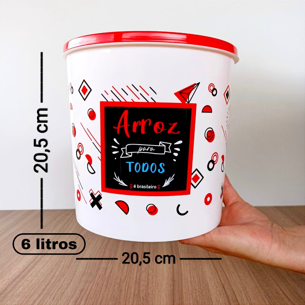 Esses potes avulsos são ideais para armazenar 5 kg de arroz. São feitos de plástico durável. Cada pote possui tampa hermética que ajuda a manter os alimentos frescos e protegidos contra umidade e insetos. CAPACIDADE: 6 litros Os potes são fabricados com material VIRGEM e LIVRES DE BPA (atóxico) Podem ser levados à geladeira e ao freezer. É seguro no micro-ondas, desde que não seja por tempo prolongado, pois podem prejudicar a fechamento das tampas. DIMENSÕES (A x D): 20,5 cm x 20,5 cm * OS POTES SÃO VENDIDOS INDIVIDUALMENTE*