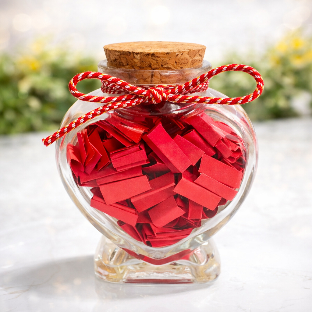 ✨ Potinho de Vidro Coração com Rolha – Um Presente Cheio de Amor ✨ Transforme pequenos gestos em grandes emoções 💖 Este delicado potinho de vidro em formato de coração, com rolha e acabamento rústico em cordão, é perfeito para guardar sentimentos, memórias e declarações inesquecíveis. Dentro dele, vão 100 papéis dobrados em formato de pequenas mensagens, que podem ser usados de duas formas: 💌 Com frases românticas prontas, ideais para surpreender quem você ama todos os dias ✍️ Ou apenas os papéis em branco, para você escrever à mão suas próprias palavras, tornando o presente ainda mais pessoal e único É aquele tipo de presente simples, mas cheio de significado. Cada papel aberto é um novo sorriso, uma lembrança, um “eu te amo” inesperado. 🎁 Ideal para: Datas comemorativas Aniversários Dia dos Namorados Casamentos e lembrancinhas Decoração romântica 📏 Detalhes do produto: Potinho de vidro em formato de coração Capacidade: 70ml Tamanho: 6cm x 7cm Fechamento com rolha Contém 100 papéis dobrados (com frases prontas ou em branco, conforme escolha) Porque amor de verdade mora nos detalhes ❤️