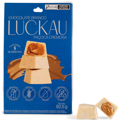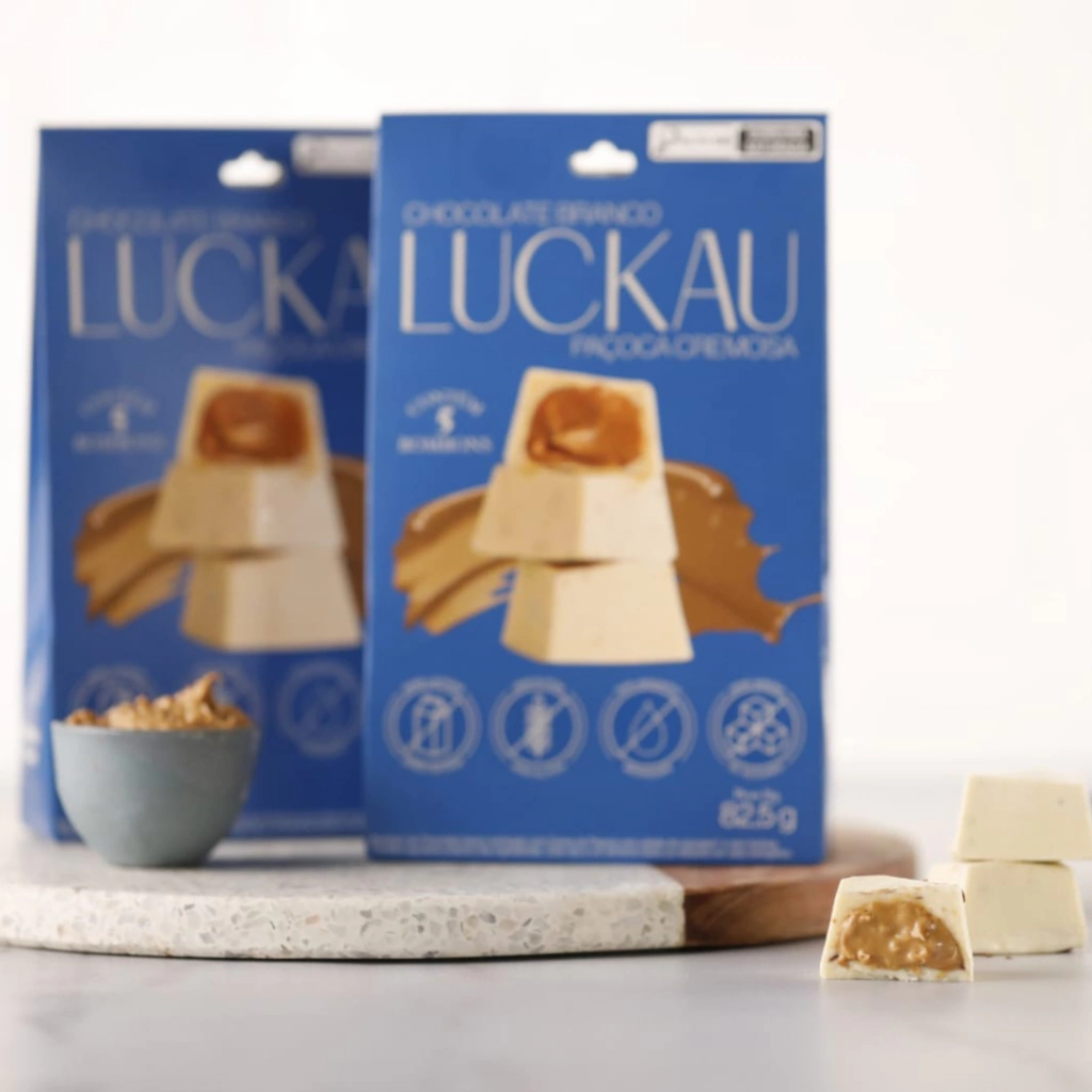Os clássicos bombons Luckau agora vêm em uma versão nova! Cada POUCH contém 5 deliciosos bombons de Luckau Branco com Creme de Paçoca Cremosa SEM GLÚTEN SEM LACTOSE SEM AÇÚCAR. Experimente toda a leveza e sabor em cada mordida. Desfrute do seu melhor momento com Luckau.