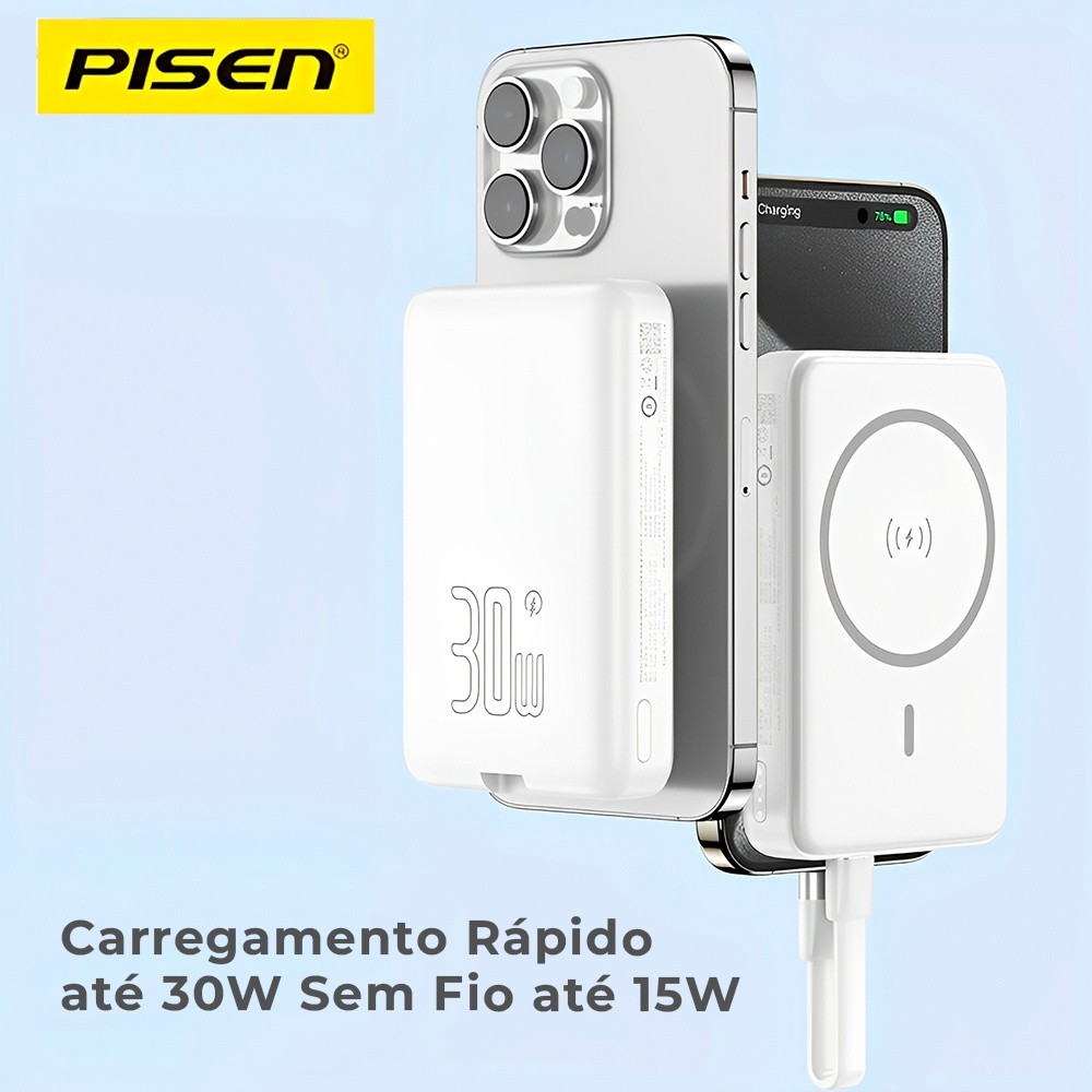 Power Bank Magnético Pisen 10000mAh 30W Branco, 2x Porta USB-C, Carregamento Rápido até 30W, Saída Simultânea e Carregamento Sem Fio até 15W, Design Compacto, Proteção Avançada 1. Carregamento Rápido e Potente (Modelo: Pisen TP-D113): O Power Bank Magnético Pisen (Modelo: Pisen 10000mAh) oferece uma potência máxima de 30W, com saídas USB-C que suportam carregamento rápido de até 20V-1,5A, permitindo recarregar seus dispositivos com rapidez e eficiência. A tecnologia de carregamento sem fio também oferece até 15W, garantindo maior flexibilidade. 2. Entrada e Saída USB-C de Alta Velocidade: O modelo Pisen TP-D113 também possui entradas Tipo C1/C2, que suportam carregamento rápido de 5V-3A/9V-2A/12V-1,5A, e saídas USB-C que oferecem potência de até 20V-1,5A, permitindo uma experiência de carregamento eficiente e sem interrupções. 3. Tecnologia Avançada de Proteção: O Power Bank Pisen 10000mAh inclui funções de proteção avançada contra superaquecimento, sobrecorrente, sobrecarga, descarga excessiva e curto-circuito, garantindo maior segurança para seus dispositivos durante o carregamento. 4. Design Compacto e Prático: O modelo Pisen TP-D113 10000mAh possui um design compacto e moderno, que facilita o transporte e o uso diário. Seu tamanho reduzido torna-o ideal para viagens ou para quem busca praticidade sem abrir mão de desempenho. 5. Saída Simultânea e Alta Compatibilidade: Com saídas simultâneas de 5V-3A e potência máxima de 30W, o Power Bank Pisen oferece alta compatibilidade para carregar dois dispositivos ao mesmo tempo, otimizando o tempo de carregamento. Garantia 90 dias.