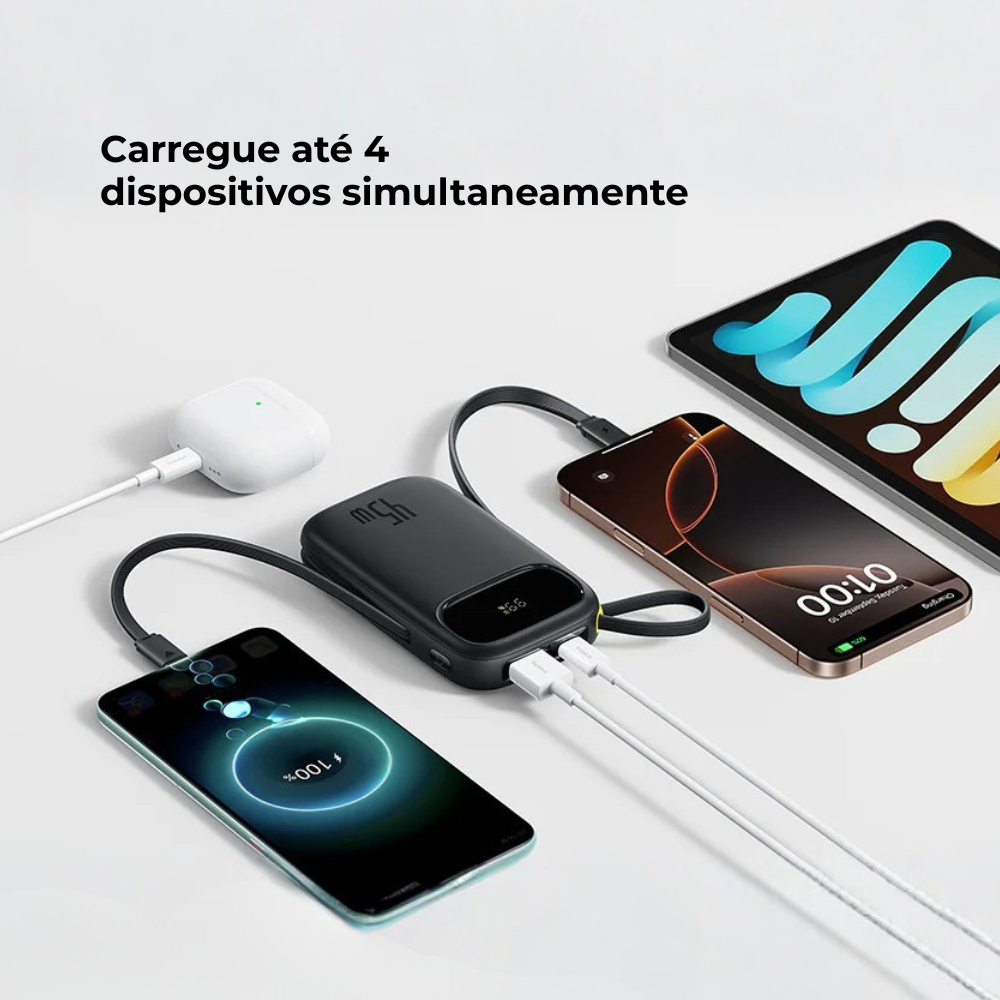 ⚡ Power Bank Baseus EnerFill FC31 20000mAh 22.5W – 2 Cabos Integrados + Display Digital Turbo O Power Bank Baseus EnerFill FC31 é a solução definitiva para quem busca potência, praticidade e segurança no dia a dia. Com 20.000mAh de capacidade real e carregamento rápido de até 22,5W, ele mantém seus dispositivos carregados em qualquer lugar, oferecendo alto desempenho para smartphones iPhone e Android, tablets, fones, câmeras e muito mais. Com dois cabos integrados (Lightning + USB-C), você não precisa carregar fios extras. Além disso, o FC31 conta com duas portas adicionais (USB-A e USB-C), permitindo carregar até 4 dispositivos simultaneamente. Ideal para uso no trabalho, viagens, estudo e emergências. O display digital inteligente mostra o nível exato de bateria, enquanto o sistema NTX de resfriamento com grafeno garante temperatura estável e uso seguro durante longas sessões de carregamento. Leve, compacto e equipado com cordão para transporte, ele cabe na bolsa, mochila e até mesmo no bolso. ✨ Principais Características Capacidade real: 20.000mAh (3.65V / 73Wh) Carregamento rápido: até 22,5W 2 cabos integrados: Lightning + USB-C 4 dispositivos ao mesmo tempo (cabos + USB-A + USB-C) Display digital de porcentagem Estrutura compacta e portátil Tecnologia NTX com grafeno para resfriamento inteligente Cordão acoplado para transporte Seguro para viagens de avião Construção resistente e acabamento premium 🔌 Entradas Cabo USB-C (entrada): 5V=3A 9V=2,22A 10V=2,25A 12V=1,5A Porta USB-C (entrada): 5V=3A 9V=2,22A 10V=2,25A 12V=1,5A ⚡ Saídas Cabo Lightning: 5V=3A 9V=2,22A Cabo USB-C: 5V=3A 9V=2,22A 10V=2,25A 12V=1,5A Porta USB-C: 5V=3A 9V=2,22A 10V=2,25A 12V=1,5A Porta USB-A: 5V=3A 9V=2A 10V=2,25A 12V=1,5A 📱 Compatibilidade iPhones (incluindo modelos com Fast Charge) Smartphones Android Tablets AirPods, fones, caixas de som, câmeras e acessórios Qualquer dispositivo USB ou USB-C 🎒 Ideal para ✔ Viagens ✔ Trabalho e estudos ✔ Uso diário ✔ Quem quer liberdade sem depender de tomadas 📦 Conteúdo da Embalagem 1x Power Bank Baseus EnerFill FC31 20000mAh 1x Manual do usuário ✔️ Loja Oficial Baseus Brasil na Shopee ✔️ Produto Original, Novo e Lacrado ✔️ Homologado pela ANATEL ✔️ Garantia oficial de 12 meses ✔️ Emitimos Nota Fiscal
