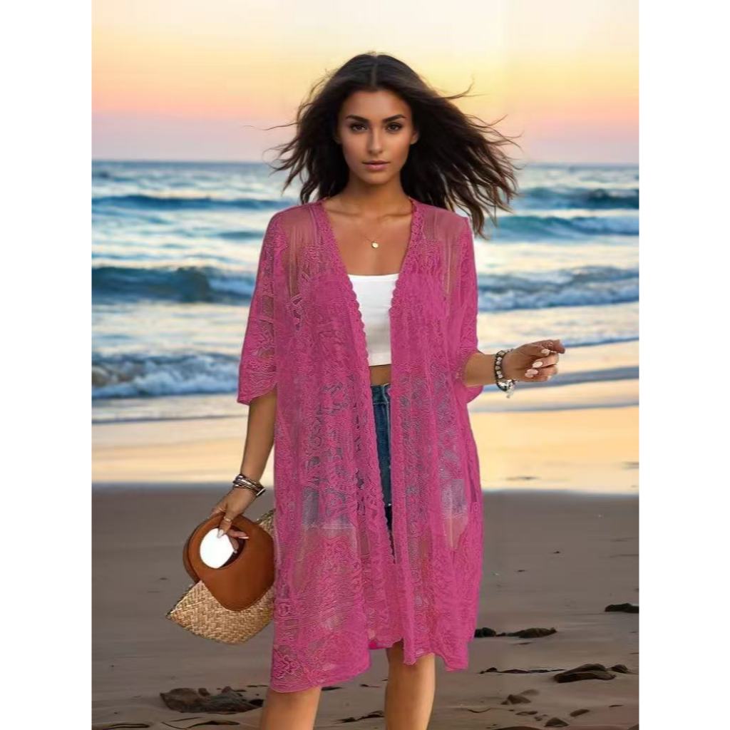 Praia-26504Cardigan See-through Thin Lace Bordado De Três Trimestres Manga Sólida Cor Mif Comprimento Solto Ponto Aberto