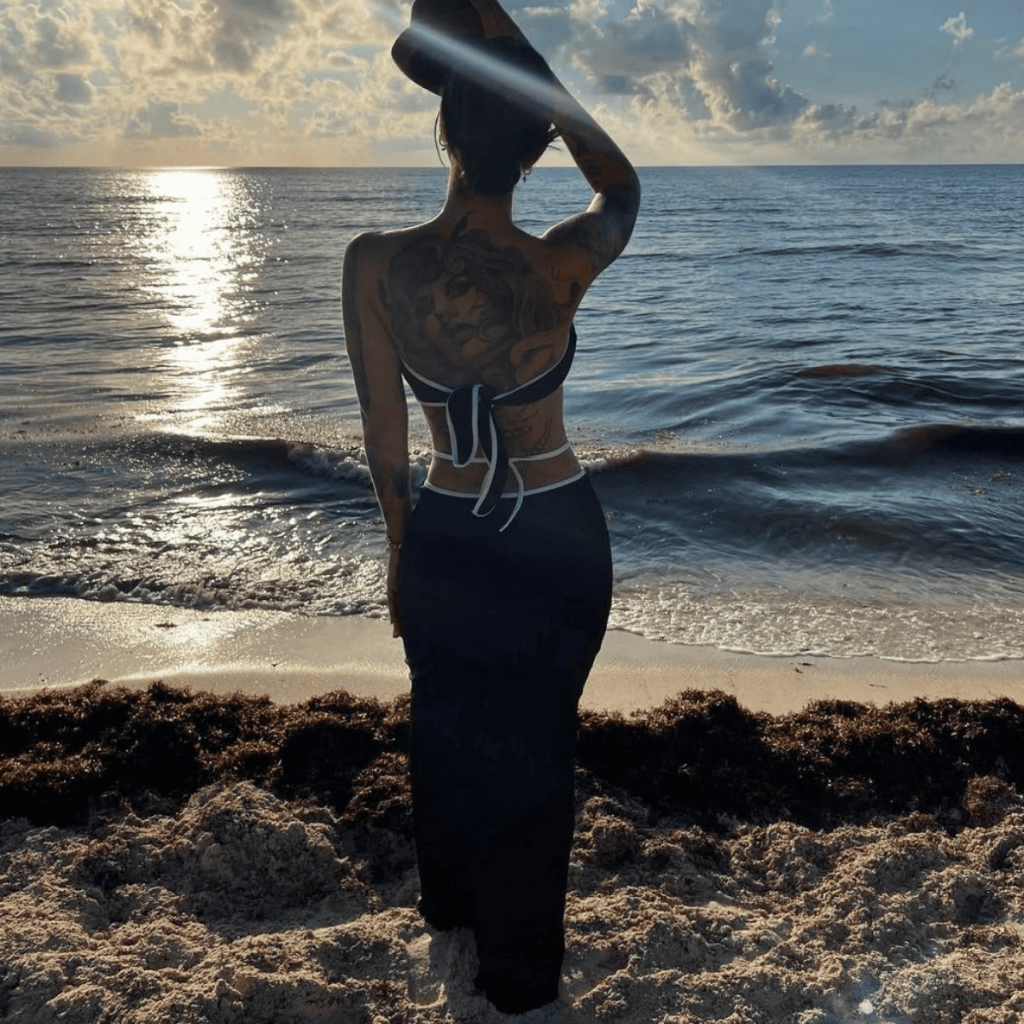 Praia Saia Longa e Top Faixa com Amarração Costas - Look Verão 2026 Tendência Feminina