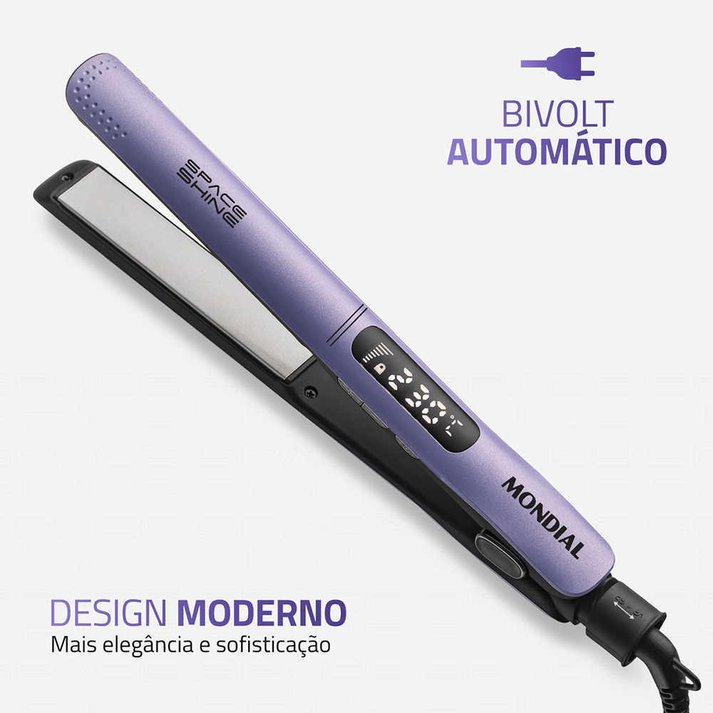 Prancha Alisadora Space Shine P-26 Mondial 50W Lilás Bivolt A Prancha Alisadora Space Shine P-26 da Mondial combina tecnologia, desempenho e praticidade para garantir um alisamento impecável com brilho intenso. Seu revestimento cerâmico com Tourmaline Íon libera íons que selam as cutículas dos fios, proporcionando luminosidade, maciez e redução do frizz. O painel digital permite ajuste preciso de temperatura entre 100°C e 230°C, atendendo a todos os tipos de cabelo. Com aquecimento rápido em menos de 1 minuto, chapas flutuantes e patins longos, proporciona um deslize suave e uniforme, alisando uma maior quantidade de cabelo de uma só vez. Compacta, bivolt e com trava de segurança, é ideal para uso diário e viagens. Características: Brilho Extremo: Chapas de cerâmica com Tourmaline Íon para fios mais radiantes e macios. Painel digital com Controle de Temperatura: Ajustes de 100°C a 230°C para todos os tipos de cabelo. Aquecimento Rápido: Alcança a temperatura máxima em menos de 1 minuto. Chapas Flutuantes: Adaptam-se ao movimento dos fios para um alisamento uniforme e sem marcas. Patins Longos: Placas mais compridas para alisar mais cabelo de uma só vez. Bivolt: Compatível com 127V e 220V. Design Slim e Trava de Segurança: Mais facilidade para armazenar e transportar. Cabo Giratório 360° com 1,8m: Mais autonomia de movimento. Dimensões: Largura da Placa: 3,2 cm Peso aproximado: 0,41 kg Itens Inclusos: 01 Prancha Alisadora Manual de Instruções Manual de Assistência Técnica Garantia: 12 meses (Fornecedor: Mondial) Observações: Imagem meramente ilustrativa. As informações são de responsabilidade do fabricante/fornecedor. As cores podem variar conforme a configuração do seu monitor. Verifique a voltagem antes da compra.