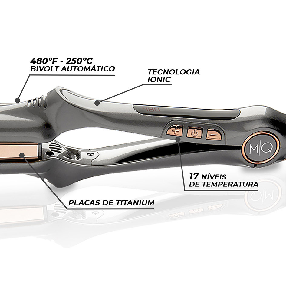A prancha chega à impressionante temperatura de 480ºF, perfeita para progressivas em cabelos mais grossos e volumosos. Graças a tecnologia de placas ultra lisas de Titanium, a prancha MQ Pro 480 desliza facilmente pelas mechas, reduzindo o seu esforço e melhorando a sua disposição. Com esta prancha, você terá o liso perfeito em apenas três passadas, atendendo duas clientes no tempo de uma. Com seu controle de 17 níveis de temperatura, você consegue realizar diferentes procedimentos e alisar todos os tipos de cabelo. Possui um exclusivo formato ergonômico, que protege sua saúde de movimentos repetitivos e queimaduras. Chegou a sua vez de fazer alisamentos com a prancha testada e aprovada por milhares de profissionais do mundo inteiro. Especificações: Material das placas: Nova liga de Titaniu Temperatura mínima: 190°F / 88°C Temperatura máxima: 480°F / 250°C Ajustes de temperatura: Sim - 17 níveis MCH: Sim - Recuperação imediata da Temperatura Placas Flutuantes: Sim - Reduz a tensão no punho e mão Íons: Placas ionizadas Progressiva: Sim Display LED: Sim Tamanho das placas : 32MM Ponta antitérmica: Sim Potência: 45W Tipo de cabo: Giratório Tamanho do cabo: 3M Voltagem: Bivolt Automático Design: Ergonômico Cor: Chumbo e detalhes Rose Gold Pintura: Brilhante Dimensão do produto: 32x7x4 Peso do produto: 262g Peso Bruto com embalagem: 0,68Kg EAN: 7898657691138 Frequência: 50/60Hz Material da carcaça: PA Garantia: - 6 Meses Conteúdo da Embalagem: - 1 Prancha MQ Pro 480, 1 Bolsa de veludo, 1 Manual e 1 Relação de Postos Autorizados