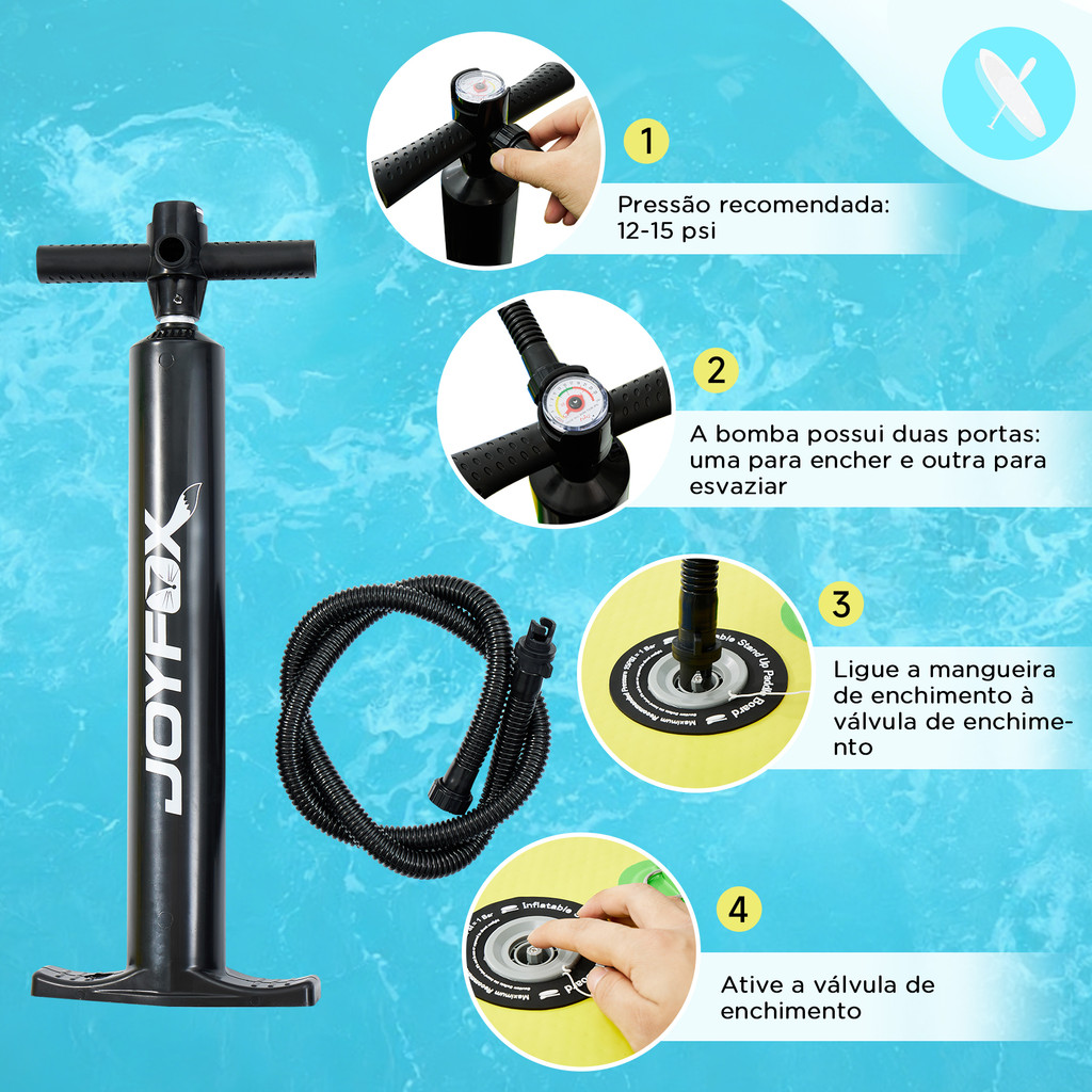 Desbrave as águas com a Prancha Stand Up Paddle Joyfox! Seja você um iniciante ou um remador experiente, nossa prancha inflável oferece a combinação perfeita de estabilidade, durabilidade e estilo. Com uma capacidade de carga impressionante de 278kg, é ideal para passeios em família ou para levar seu pet a bordo! Destaques do Produto: Alta Estabilidade: Com 320cm de comprimento e 80cm de largura, oferece equilíbrio superior em lagos, rios e mar. Construção Premium: Fabricada em PVC de alta resistência com tecnologia Drop Stitch (2600G), garantindo rigidez similar a uma prancha rígida quando inflada. Kit Completo "Pronto para a Água": Inclui todos os acessórios necessários, desde a bomba de alta pressão até a bolsa impermeável para celular. Design Vibrante: Fundo amarelo com deck antiderrapante em verde-água, garantindo visibilidade e segurança. Especificações Técnicas: Dimensões da Prancha: 320 x 80 x 15 cm (10.6' x 31'' x 6'') Peso Máximo Suportado: 278 kg (612 lbs) Flutuabilidade: 278 L Pressão Recomendada: 15 PSI (1.02 bar) Material: PVC reforçado (Camada dupla 0.55mm / 1000D) Remo Ajustável: Comprimento total de 210cm (haste de 170cm) Tamanho Dobrada (Portabilidade): 87 x 30 x 18 cm