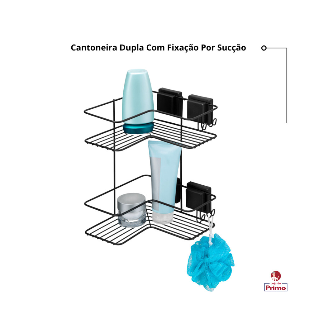 Prateleira Cantoneira Dupla para Shampoo, Condicionador e Sabonete com Ventosa - Cromado e Preto - Arthi A Prateleira Cantoneira Dupla da Arthi é a solução perfeita para organizar seus produtos de higiene pessoal no box de forma prática e estilosa. Feita com estrutura cromada e detalhes em preto, essa prateleira possui dois níveis, ideal para acomodar shampoos, condicionadores e sabonetes. Com fixação por ventosas adesivas, ela dispensa o uso de furadeiras, oferecendo uma instalação simples, resistente e sem danos à parede. Características: - Material: Estrutura em aço cromado de alta qualidade, com detalhes em preto, resistente à umidade e que não enferruja. - Fixação: Sistema de ventosas adesivas de alta aderência, fácil de instalar sem necessidade de furos. - Design: Cantoneira dupla com dois níveis de armazenamento, perfeita para organizar diversos produtos no box. - Capacidade: Suporta shampoos, condicionadores, sabonetes e outros itens essenciais de banheiro. - Dimensões: Design compacto que aproveita ao máximo os cantos do box, sem ocupar muito espaço. Benefícios: - Fácil de instalar com ventosas adesivas que garantem uma fixação firme, sem danificar paredes ou azulejos. - Resistente à umidade e à corrosão, ideal para ambientes com alta exposição à água. - Organização eficiente com dois níveis de prateleiras, mantendo seus produtos sempre à mão e o box livre de desordem. A Prateleira Cantoneira Dupla da Arthi é a escolha perfeita para quem valoriza praticidade e estilo. Com um design sofisticado e um sistema de instalação sem complicações, ela torna o seu banheiro mais organizado e bonito, permitindo que você tenha tudo o que precisa ao seu alcance. Ideal para otimizar o espaço no box e manter o ambiente sempre limpo e funcional!