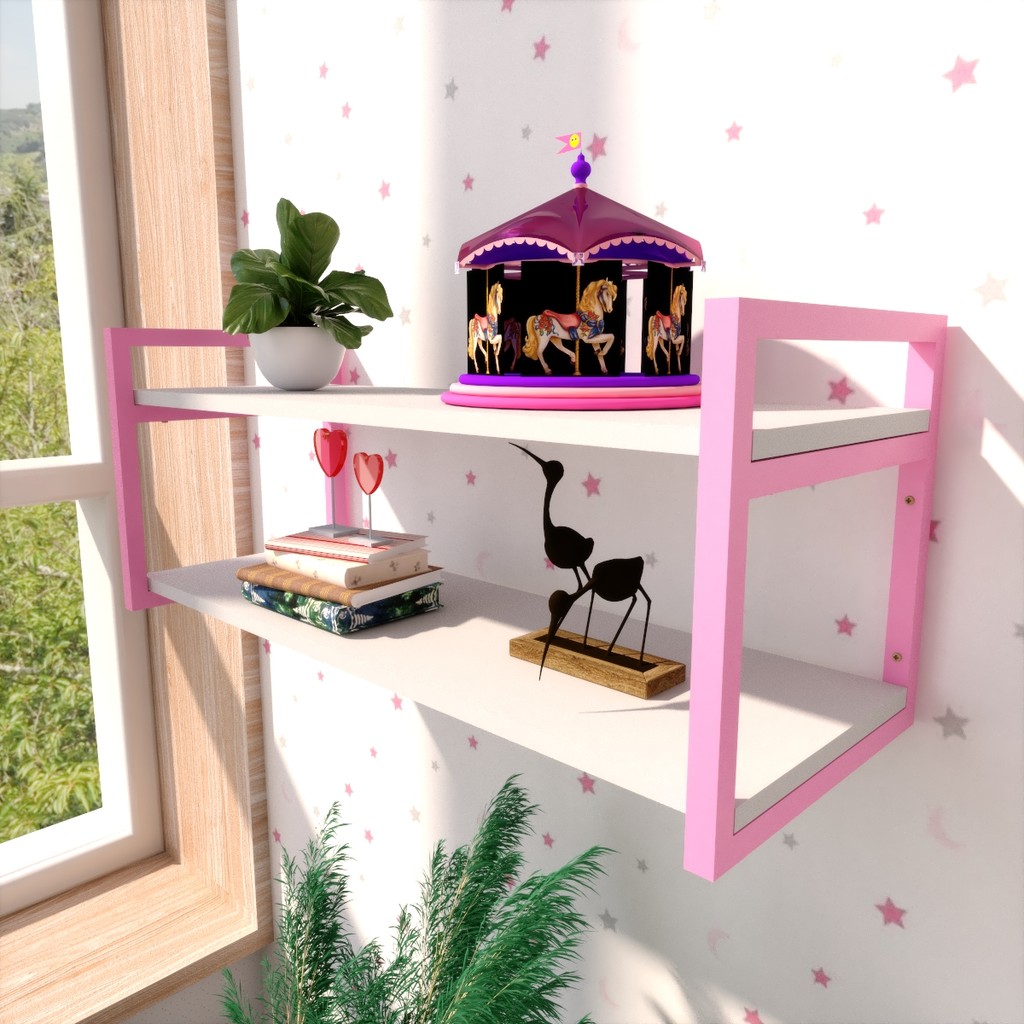Prateleira colorida infantil estilo industrial Quarto de criança menina brinquedos rosa branco 60 cm