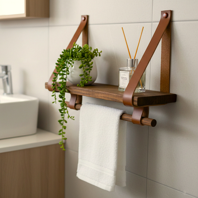 Prateleira com Suporte Para Toalha Madeira Envelhecida e Couro Decoração Banheiro Rústico Boho Chic