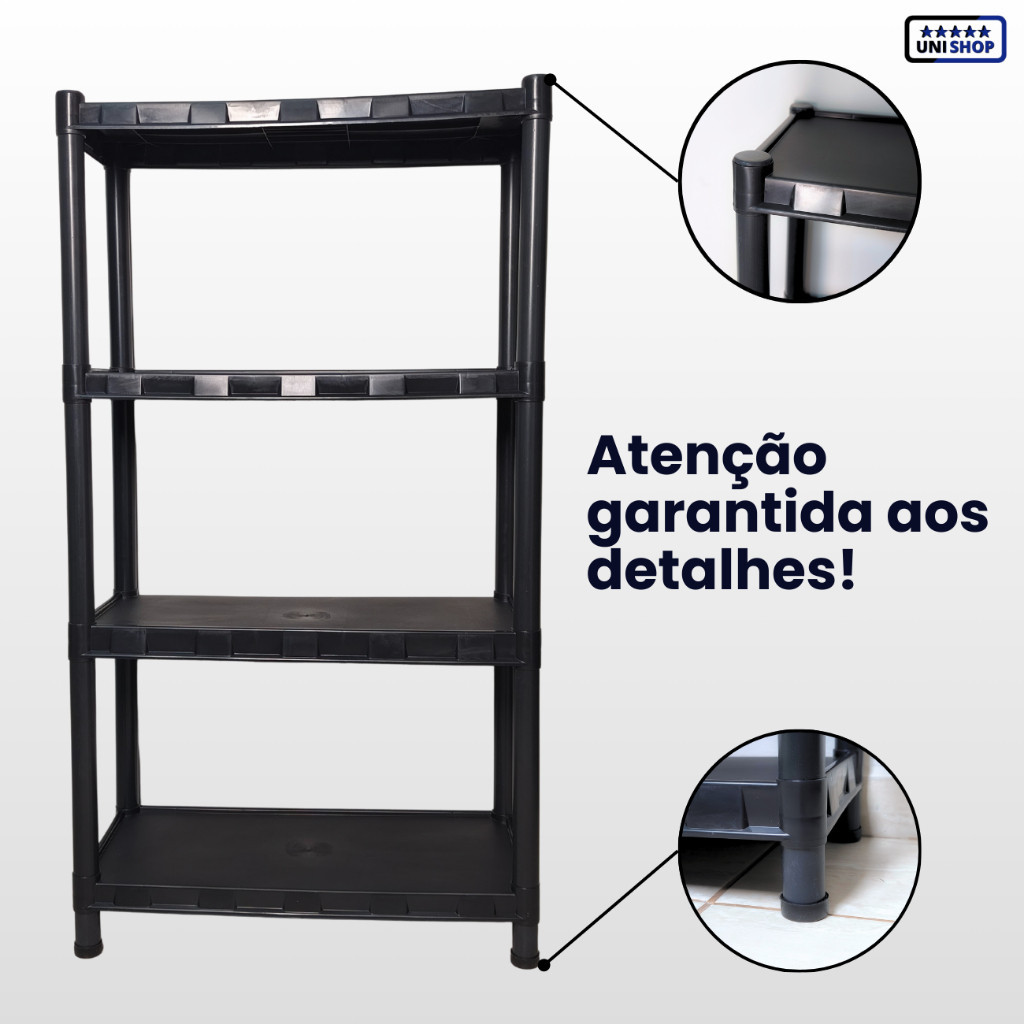 Prateleira Multiuso com até 7 Níveis Estante Organizadora com Pézinho em Plástico Reforçado Modular IDEAL PARA SUA ORGANIZAÇÃO : ESCRITORIOS, COZINHAS, BANHEIROS, BRINQUEDOS, JOGOS, QUARTO, ORGANIZAR SAPATOS, LAVANDERIA, ENTRE OUTROS ESTANTE PRETA COM 2 até 7 PRATELEIRAS COM PEZINHOS Medidas e Propriedades do Produto ESTANTE PRETA COM 2 NÍVEIS Plástico POLIPROPILENO Suporta até 7 Kg por prateleira Dimensões : Altura: 48 cm Comprimento: 55 cm Largura: 25 cm Distância entre as prateleiras 27 cm Com 2 Prateleiras ESTANTE PRETA COM 3 NÍVEIS Plástico POLIPROPILENO Suporta até 7 Kg por prateleira Dimensões : Altura: 75 cm Comprimento: 55 cm Largura: 25 cm Distância entre as prateleiras 27 cm Com 3 Prateleiras ESTANTE PRETA COM 4 NÍVEIS Plástico POLIPROPILENO Suporta até 7 Kg por prateleira Dimensões : Altura: 102 cm Comprimento: 55 cm Largura: 25 cm Distância entre as prateleiras 27 cm Com 4 Prateleiras ESTANTE PRETA COM 5 NÍVEIS Plástico POLIPROPILENO Suporta até 7 Kg por prateleira Dimensões : Altura: 136 cm Comprimento: 55 cm Largura: 25 cm Distância entre as prateleiras 27 cm Com 5 Prateleiras ESTANTE PRETA COM 6 NÍVEIS Plástico POLIPROPILENO Suporta até 7 Kg por prateleira Dimensões : Altura: 164 cm Comprimento: 55 cm Largura: 25 cm Distância entre as prateleiras 27 cm Com 6 Prateleiras ESTANTE PRETA COM 7 NÍVEIS Plástico POLIPROPILENO Suporta até 7 Kg por prateleira Dimensões : Altura: 196 cm Comprimento: 55 cm Largura: 25 cm Distância entre as prateleiras 27 cm Com 7 Prateleiras