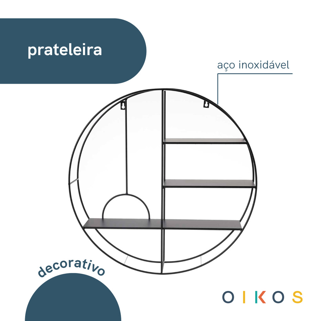 "conheça a prateleira nicho de metal redondo 3 andares da Oikos! moderno e resistente, é perfeita para organizar livros, plantas, vasos, cosméticos e o que quiser!? ? é de aço inoxidável?: decorativo e durável. para limpar basta um pano úmido e nada mais! não deixe submerso na água. depois da limpeza, quando estiver completamente seco, é só guardar num local arejado. leve qualidade e organização para sua casa! medidas: comprimento: 50,8 cm largura: 10 cm altura: 49,5"