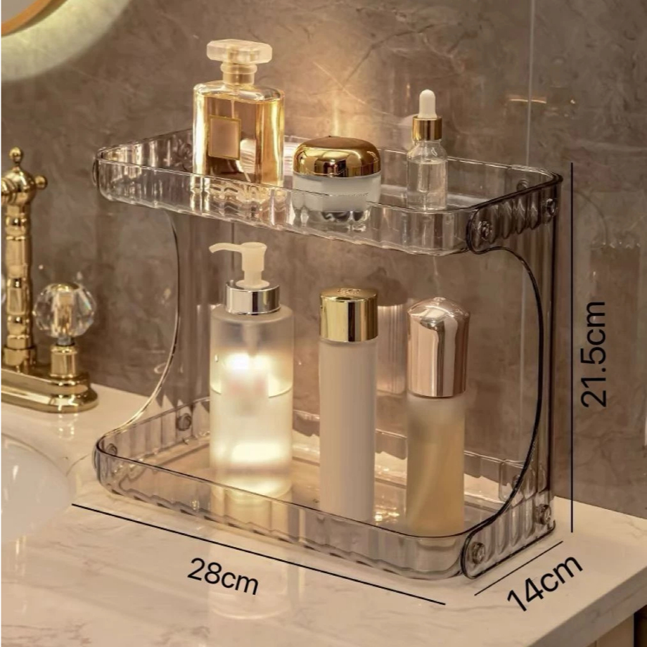 Organizador Prateleira Diamante Acrílico Porta Maquiagem Âmbito de aplicação: armazenamento de banheiro, cosméticos, produtos para cuidados com a pele, armazenamento de artigos diversos, armazenamento de banheiros, cosméticos, produtos para cuidados com a pele, armazenamento de artigos diversos, etc. Item Incluso: - Prateleira Organizadora com 2 andares - Botões para Fixação da Prateleira Especificacoes Tecnicas: Medidas: Altura: 21,5cm x Largura: 28cm x Comprimento: 14cm Material: Plástico PET Cor : Transparente, Dourado e Cinza Cristal