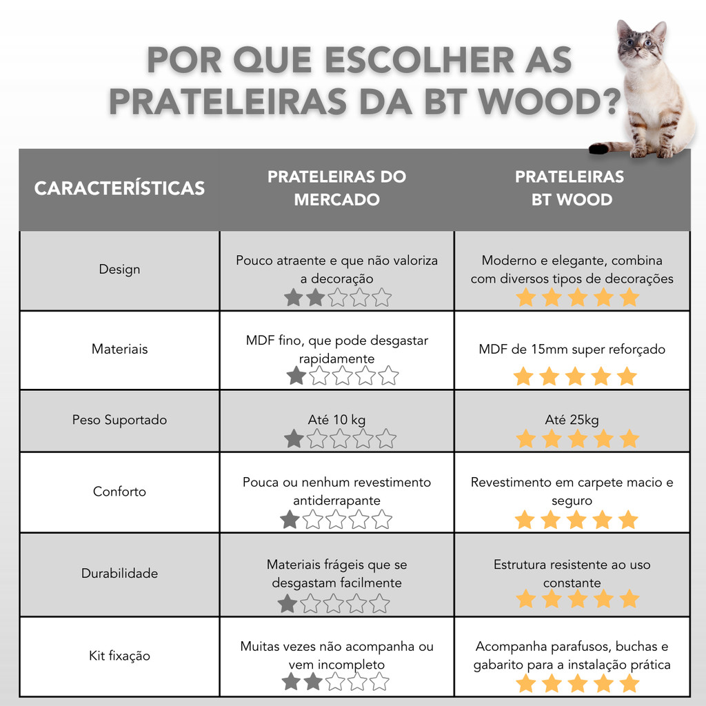 Prateleira Para Gatos de Canto Interno BT WOOD: Aproveite Cada Cantinho com Estilo, Segurança e Conforto Gatos adoram escalar, observar tudo do alto e explorar novos caminhos, isso faz parte do comportamento natural deles. Para facilitar essa rotina e aproveitar melhor o espaço da casa, a BT WOOD desenvolveu a Prateleira de Canto, uma peça resistente, prática e perfeita para transformar qualquer cantinho em parte do playground do seu felino. Produzida em MDF cru de 15mm, essa prateleira oferece robustez e segurança, com estrutura totalmente parafusada, garantindo firmeza durante as subidas, pulos e descanso do seu gatinho. O formato em L foi pensado para aproveitar cantos internos da parede, criando rotas verticais contínuas, conectando ambientes e ampliando o espaço de exploração do seu gato. Importância da Prateleira Além de complementar a decoração, essa prateleira contribui diretamente para o bem-estar felino. Ela estimula a escalada, fortalece musculatura, melhora a coordenação e o equilíbrio e mantém o gato mais ativo. Lugares altos também ajudam a reduzir o estresse e oferecem mais segurança para gatos que vivem em ambientes internos. Características Técnicas Material: MDF Cru 15mm Reforçado Estrutura: Totalmente parafusada, oferecendo máxima resistência Formato: Canto em L Dimensões: • 11cm de altura • 22cm de comprimento (cada lado) Fixação: Acompanha parafusos e buchas Indicação: Ideal para complementar o playground BT WOOD Capacidade: Suporta até 25kg Super resistente e pronta para uso diário Com a Prateleira de Canto Interno BT WOOD, até os cantinhos esquecidos se transformam em áreas seguras, funcionais e cheias de diversão para o seu gato.