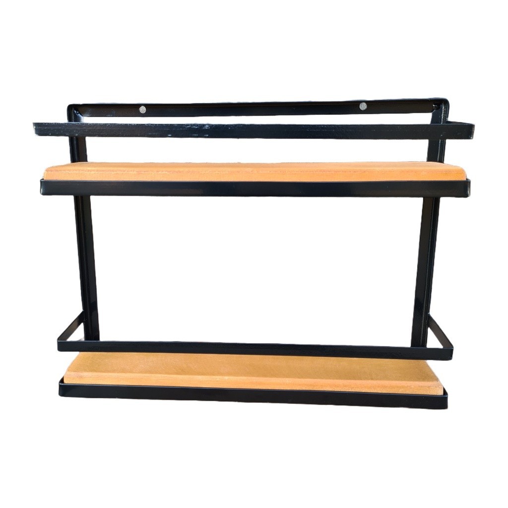 Prateleira de 2 andares produzida artesanalmente com ferro e madeira. A ferragem possui pintura eletrostática para não enferrujar e não arranhar com facilidade, material reforçado, garantido assim maior durabilidade. A madeira é lixada e finalizada com cera em carnaúba. Além de organizadora e sofisticada, é muito charmosa, decorando o ambiente. Indispensável para qualquer ambiente. Dimensões do produto: Altura: 32cm Largura: 11cm Comprimento: 42cm Diâmetro: 10cm Altura entre um andar e outro: 18cm Peso aproximado: 2,200kg Não acompanha parafusos de fixação. Indicado para cozinhas, área de churrasco, espaço gourmet... Produto 100% artesanal, podendo assim conter variação na tonalidade de cor, formato e tamanho. por gentileza realizar a compra de qualquer produto separadamente, pois devido algumas medidas não conseguimos enviar todos no mesmo pacote!