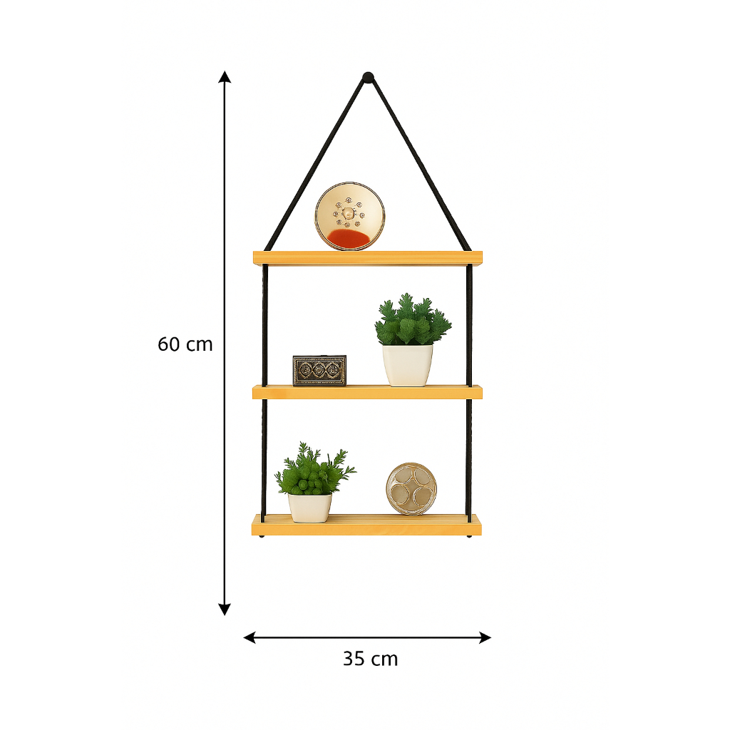 PRODUTO EM ESTOQUE ENVIO IMEDIATO FABRICAÇÃO PRÓPRIA. Madeira: Pinus Cordão: Corda de algodão Dimensão: 35cm x 10cm x 66cm Capacidade: Máx. 10kg Recomendamos que não ultrapasse o limite de capacidade citado acima, para maior durabilidade do seu produto! Conteúdo: 01- prateleira suspensa de 3 andares