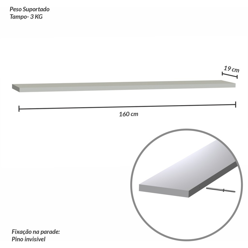 Descrição: Esta prateleira é em MDP de 25mm com profundidade de 190mm, possui três medidas diferentes 1350mm, 1500mm e 1795mm. É um produto que você poderá instalar na parede de qualquer ambiente com pinos invisíveis, montando uma decoração para alegrar seu ambiente com plantas, livros e objetos personalizando e deixando-o exclusivo. Características: - Garantia: 3 Meses - Peso Máximo Suportado: 3Kg - Recomendações de manutenção: Com pano umedecido. Não aplicar lustra móveis.