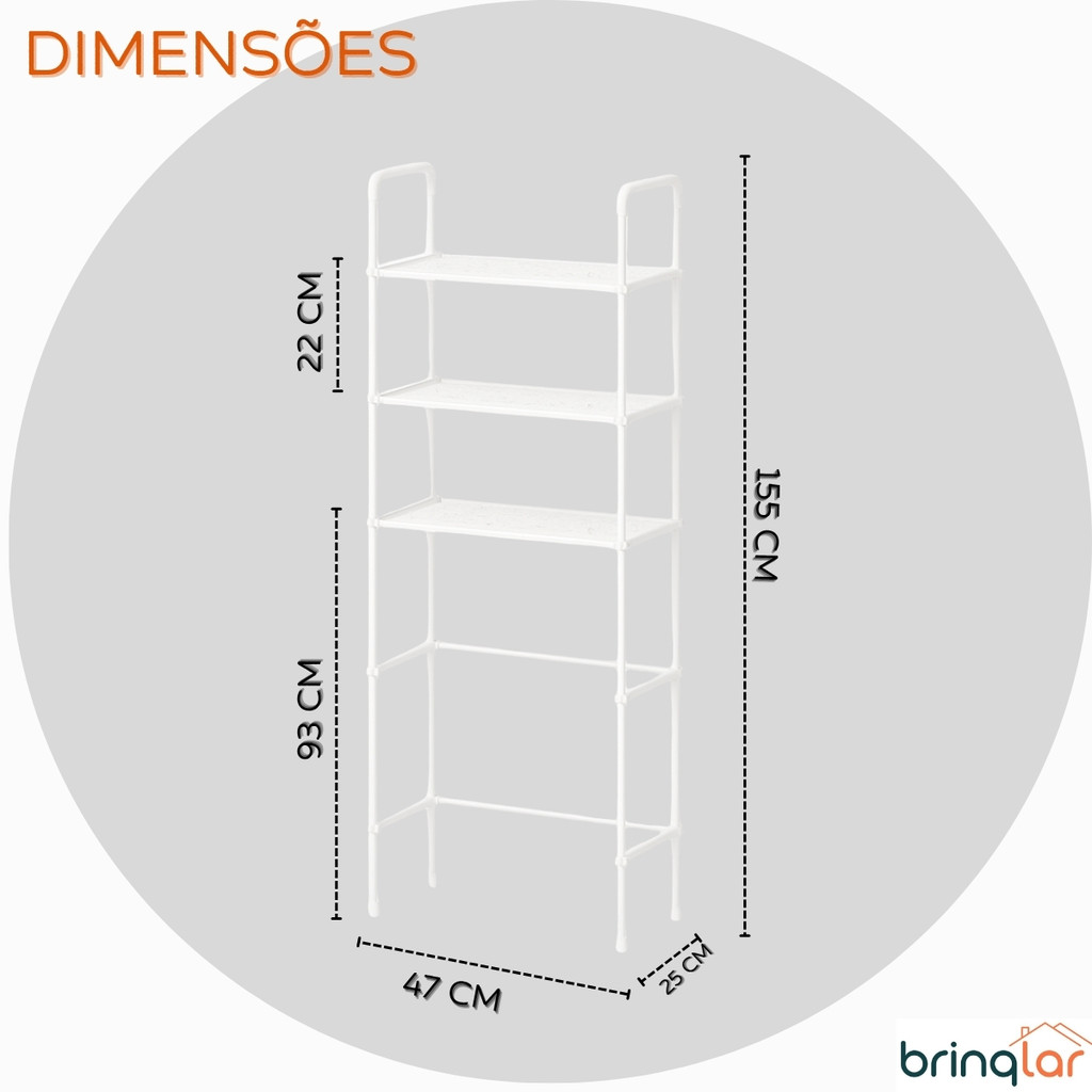 O anúncio contém: 01 Prateleira Organizadora Multifuncional para Banheiro. Perfeita para organizar o banheiro com praticidade e estilo, aproveitando o espaço acima do vaso sanitário. Ideal para manter toalhas, produtos de higiene e itens decorativos sempre à mão, deixando o ambiente funcional e elegante. Com 3 prateleiras amplas, oferece organização funcional e fácil acesso a tudo que você precisa, mantendo sua casa organizada. Além disso, seu design moderno e versátil combina facilmente com qualquer estilo de decoração, unindo praticidade e elegância em um só produto. Aproveitamento de espaço: ideal para banheiros pequenos, utiliza o espaço vertical acima do vaso sanitário. Organização prática: mantém toalhas, cosméticos, papéis e itens de higiene sempre à mão. Design moderno: estrutura metálica com linhas limpas que combina com qualquer decoração. Fácil de montar: instalação simples e sem necessidade de furar paredes. Alta durabilidade: fabricada em metal resistente à umidade e à corrosão. Versatilidade: pode ser usada também em lavanderias ou áreas de serviço. Especificações: Marca: Brinqlar. Material: Metal e Plástico. Dimensões aproximadas do produto (AxLxC): 157cm x 25cm x 47cm Distância entre cada prateleira: 22cm Espaço do chão à primeira prateleira: 93cm Observações: - Produto novo e em estoque. - Todos os produtos têm seguro contra extravio. - As cores do produto podem variar de acordo com o lote de fabricação. - Em caso de cópia dessa descrição e/ou fotos, os responsáveis serão cobrados de acordo com a Lei (9.610/98) de Direitos Autorais.