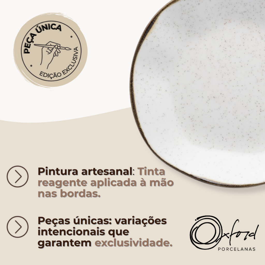 SOBRE O PRODUTO CONJUNTO 06 PRATOS FUNDOS - OXFORD MARESIA A coleção Ryo Maresia traz uma composição que valoriza a beleza das praias, o toque da areia e o frescor do mar. Todas as peças da coleção Ryo Maresia recebem aplicação de esmalte com pigmentação e de um filete reagente aplicado de forma manual garantindo a unicidade de cada peça. Produzido em porcelana, o conjunto de pratos fundos Ryo Maresia é composto por 6 pratos fundos, que podem ser levados ao micro-ondas e à máquina de lavar louças. Conteúdo da embalagem: 6 pratos fundos com 22,5 cm de diâmetro ESPECIFICAÇÕES: Uso: Resistente a micro-ondas, Resistente a lava-louças Tipo: Prato Fundo Material: Porcelana Tipo de Embalagem: Papel Pardo Cor: Branco, Marrom
