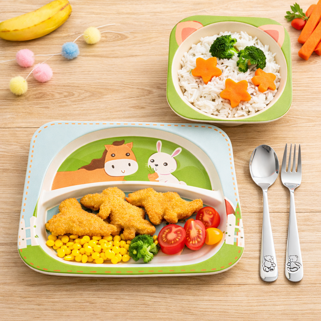 Prato infantil com divisoria kit pratinho com talher e tigela para bebê e criança fibra de bambu