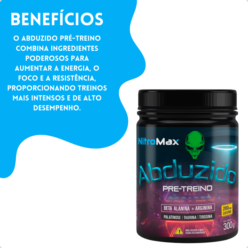 Descrição O Pré Treino ABDUZIDO auxilia no aumento do desempenho físico durante exercícios repetidos de curta duração e alta intensidade. SUCESSO DE VENDAS E QUERIDINHO NO SEU TREINO AGORA COM MAIS CONCENTRAÇÃO DE BETALANINA. SUA PODEROSA FORMULÇÃO: BETA-ALANINA: Um aminoácido extremamente importante para melhora do desempenho, uma vez que a sua ação tamponante diminui a acidose muscular, que causa a fadiga impedindo a melhor execução dos exercícios. CAFEÍNA: É responsável pelo aumento do estado de alerta e melhora do desempenho, além de agir diretamente no músculo potencializando o aumento de força e retardo da fadiga muscular. ARGININA: Potente vasodilatador, que faz com que o recebimento de nutrientes no músculo seja aumentado, melhorando a performance e otimizando a recuperação por ser precursor de óxido nítrico (NO). TIROSINA: Precursora de dopamina que é uma das substâncias responsáveis pelo bem-estar e de foco mental, sensações importantes para o momento pré-treino. TAURINA: Atua no sistema muscular, fortalecendo o processo de contração e aumento de resistência. No sistema nervoso central atua melhorando o foco e a concentração de grandes atletas. ABDUZIDO é a mais nova evolução em pré-treino formulado para atletas que buscam alta performance durante os treinos. Sua fórmula ultra concentrada, possui ação imediata garantindo maior concentração, resistência, força, energia e explosão muscular. Ainda possui em sua fórmula ingredientes que associados garantem maior vasodilatação e efeito “pump” constante. INGREDIENTES: Malto dextrina, Beta-alanina, L-arginina, L-taurina, cafeína, L-tirosina, aroma idêntico ao natural, ácido cítrico, edulcorantes xilitol e corantes artificial. ALÉRGICOS: PODE CONTER TRAÇOS DE DERIVADOS DO LEITE, DERIVADOS DA SOJA E DERIVADO DO OVO. NÃO CONTÉM GLÚTEN. SUGESTÃO DE USO: Diluir 15g (ou 3 medidas do dosador interno) em 200ml de água e ingerir preferencialmente uma hora antes do exercício para adultos maior ou igual à 19 anos. ADOÇADO COM XILITOL MÁXIMO RENDIMENTO PARA SEU TREINO