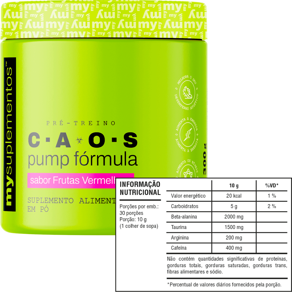 Pré-Treino CAOS Pump – My Suplementos O CAOS Pump é um suplemento alimentar em pó desenvolvido para uso pré-treino. Sua fórmula combina aminoácidos e cafeína, sendo indicado para consumo antes das atividades físicas. Composição por porção (10 g): Beta-alanina: 2.000 mg Taurina: 1.500 mg Arginina: 200 mg Cafeína: 400 mg Carboidratos: 5 g Valor energético: 20 kcal Não contém quantidades significativas de proteínas, gorduras totais, gorduras saturadas, gorduras trans, fibras alimentares e sódio. Sabores disponíveis: Frutas Vermelhas Limão Ingredientes: Maltodextrina, alanina, taurina, arginina, cafeína, acidulante ácido cítrico, antiumectante dióxido de silício, aromatizante idêntico ao natural, edulcorante sucralose e: Frutas Vermelhas: corante natural de beterraba Limão: corante natural de clorofila Modo de uso: Diluir 1 colher de sopa rasa (10 g) em 200 ml de água. Consumir 1 porção ao dia, preferencialmente 30 a 45 minutos antes do treino, ou conforme orientação de profissional habilitado. Consumir imediatamente após o preparo. Avisos: Produto indicado para adultos acima de 19 anos Este produto não é um medicamento Não exceder a recomendação diária de consumo indicada na embalagem Manter fora do alcance de crianças Não deve ser consumido por gestantes, lactantes e crianças Produto direto da fábrica.