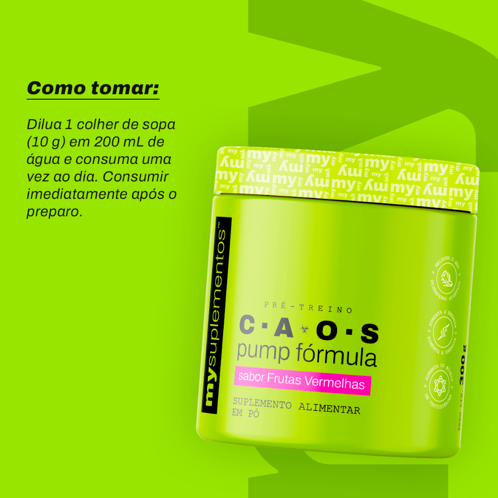 Pré-Treino CAOS Pump – My Suplementos O CAOS Pump é um suplemento alimentar em pó desenvolvido para uso pré-treino. Sua fórmula combina aminoácidos e cafeína, sendo indicado para consumo antes das atividades físicas. Composição por porção (10 g): Beta-alanina: 2.000 mg Taurina: 1.500 mg Arginina: 200 mg Cafeína: 400 mg Carboidratos: 5 g Valor energético: 20 kcal Não contém quantidades significativas de proteínas, gorduras totais, gorduras saturadas, gorduras trans, fibras alimentares e sódio. Sabores disponíveis: Frutas Vermelhas Limão Ingredientes: Maltodextrina, alanina, taurina, arginina, cafeína, acidulante ácido cítrico, antiumectante dióxido de silício, aromatizante idêntico ao natural, edulcorante sucralose e: Frutas Vermelhas: corante natural de beterraba Limão: corante natural de clorofila Modo de uso: Diluir 1 colher de sopa rasa (10 g) em 200 ml de água. Consumir 1 porção ao dia, preferencialmente 30 a 45 minutos antes do treino, ou conforme orientação de profissional habilitado. Consumir imediatamente após o preparo. Avisos: Produto indicado para adultos acima de 19 anos Este produto não é um medicamento Não exceder a recomendação diária de consumo indicada na embalagem Manter fora do alcance de crianças Não deve ser consumido por gestantes, lactantes e crianças Produto direto da fábrica.