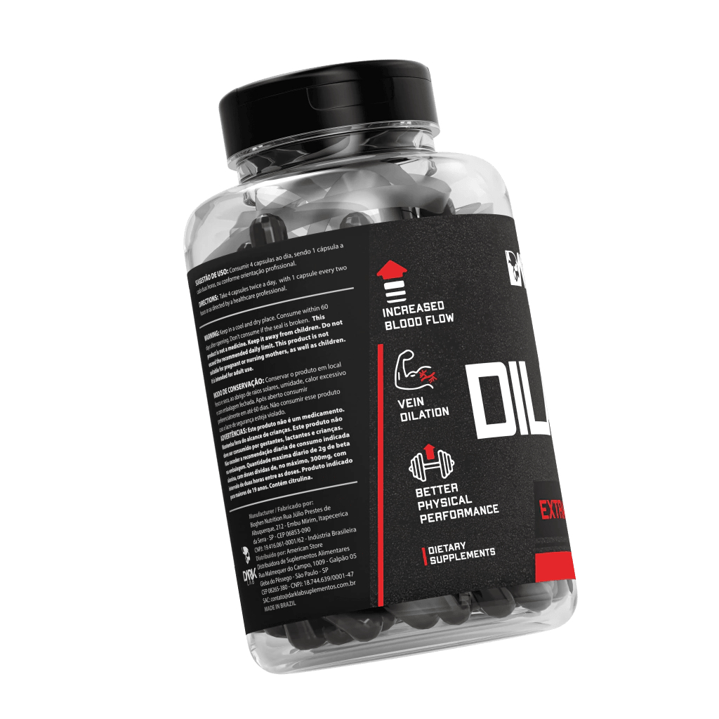 (Descrição Dilafix) ● Dilafix Extra Pump é um suplemento vasodilatador em cápsulas, que ajuda a melhorar o fluxo sanguíneo para os músculos durante o treino. Sua fórmula contém ingredientes potentes que aumentam a produção de óxido nítrico no corpo, resultando em vasodilatação, maior aporte de nutrientes e oxigênio aos músculos, e consequentemente, melhor desempenho durante o treino e recuperação mais rápida após o exercício. Experimente o melhor, entre para o Team Dark Lab. ● BENEFÍCIOS: • Promove vasodilatação; • Redução da fadiga muscular; • Melhora da circulação sanguínea; • Aceleração da recuperação; ● QUALIDADE DARK LAB: • Matéria-prima de alta qualidade; • Gluten Free. ● SUGESTÃO DE USO: •Consumir 4 cápsulas ao dia, sendo 1 cápsula a cada duas horas, ou conforme orientação profissional. ● INGREDIENTES: • L-Arginina, Beta Alanina, Alga Chondrus crispus (L-Citrulil-L-Arginina), Cafeína, Carbonato de Cálcio, Lubrificante Estearato de Magnésio, Antiumectante dióxido de Silício e Cápsula de Gelatina (Gelatina e Corantes Azul Brilhante, Eritrosina e Amarelo Tartrazina). ● CONSERVAÇÃO E ADVERTÊNCIAS: •Este produto não é um medicamento. Mantenha fora do alcance de crianças. Não exceder a recomendação diária de consumo indicada na embalagem. Produto indicado para adultos. Conservar este produto fechado, ao abrigo da luz, calor e umidade. Após aberto, consumir preferencialmente em 60 dias. ● ALÉRGICOS: •PODE CONTER AMENDOIM, LEITE, SOJA E OVO.
